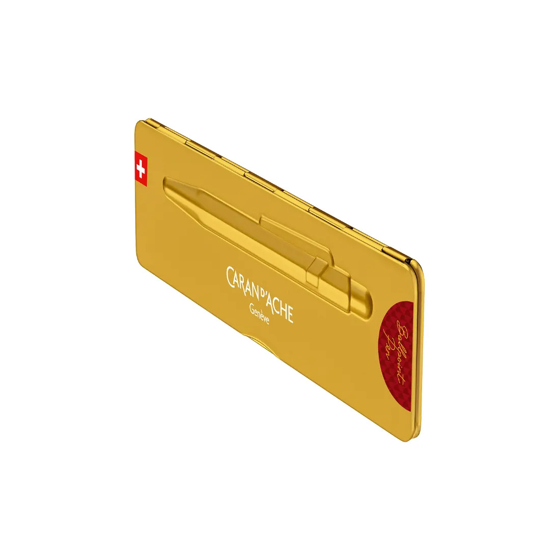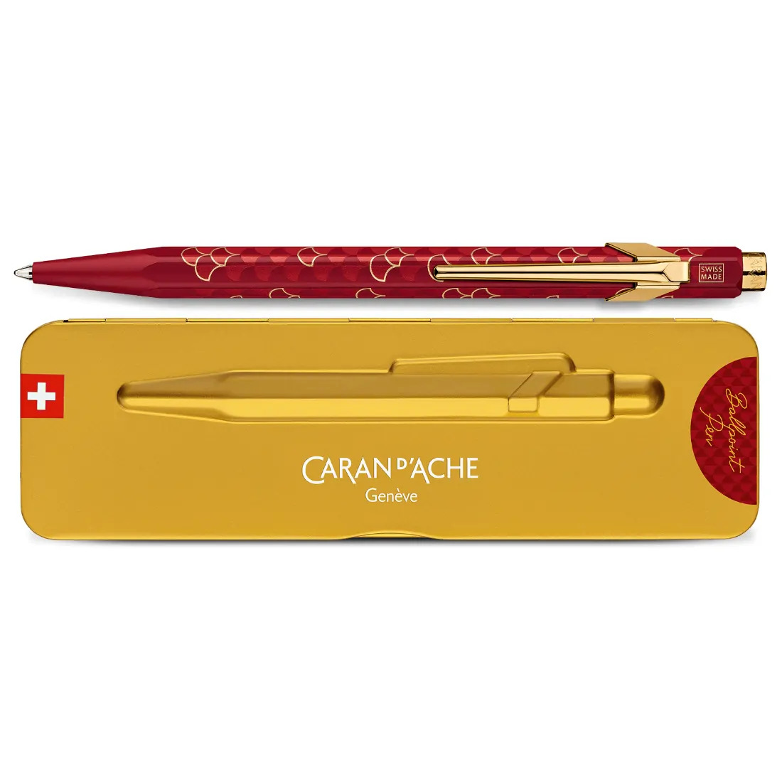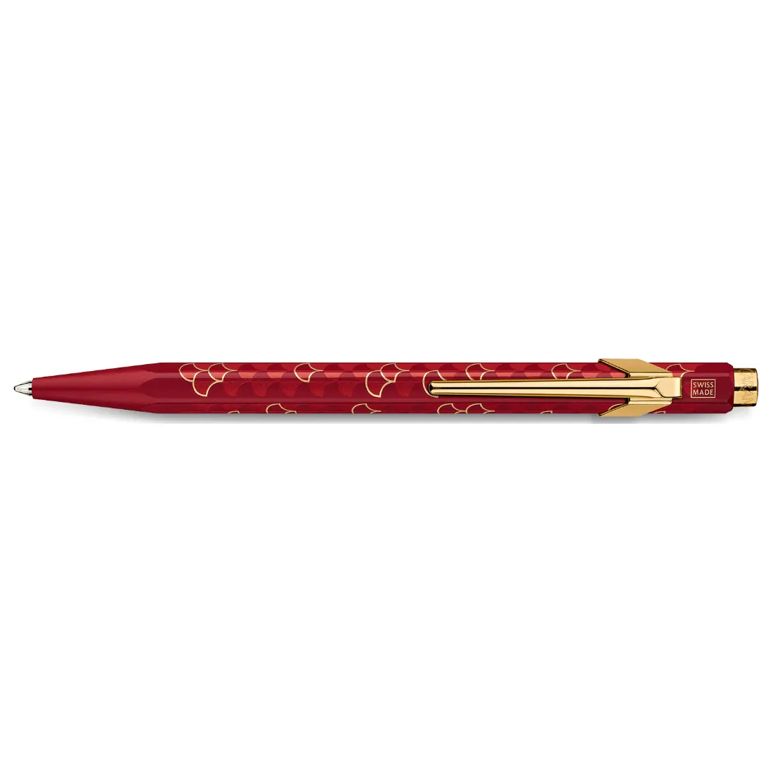 Cuerpo de aluminio hexagonal, ligero y duradero Acabado satinado rojo granate con tampografía ?escama de dragón? roja y dorada Clip y pulsador de metal flexible, ambos con acabado en oro amarillo