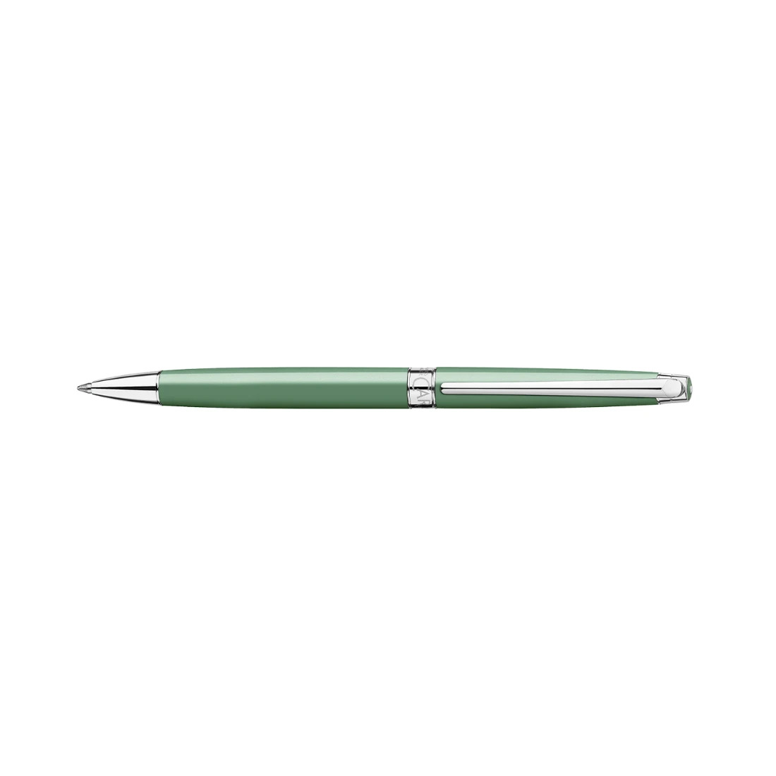 Cuerpo y capuchón de latón recubiertos de laca satinada Logotipo de Caran d Ache y ?Swiss Made? grabado en la anilla Botón con la identificación de Caran d Ache (hexágono lacado en verde gris) Mecanismo giratorio de alta precisión Clip y botón plateados y rodiados