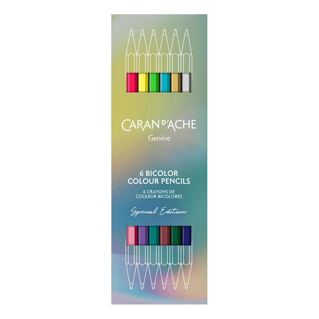 Estuche de 6 lápices exclusivos bicolor, 12 colores: 3 minas fluorescentes 3 minas metalizadas 6 minas estándar 3 minas Fluo-Minen Silver Caran d Ache + Swiss Made + logo FSC? estampado en caliente en la cara 1 mina suave y resistente de 2,8 mm