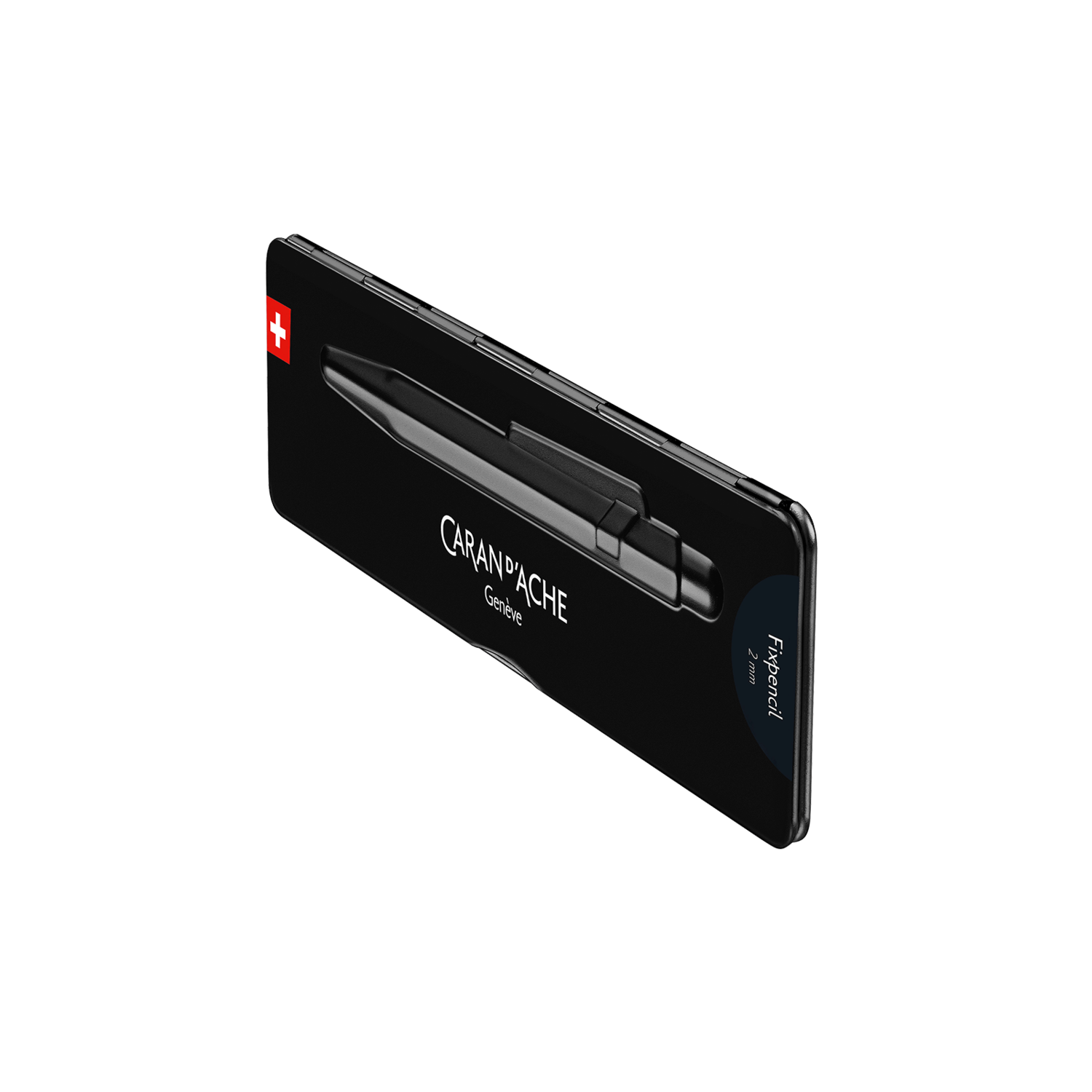 Slimpack estándar lacado en negro con el logotipo de Caran d'Ache en el interior y el exterior. Soporte magnético de silicona. Dimensiones: 199 x 59 x 16 mm. Peso: 82 g (70 g sin producto).