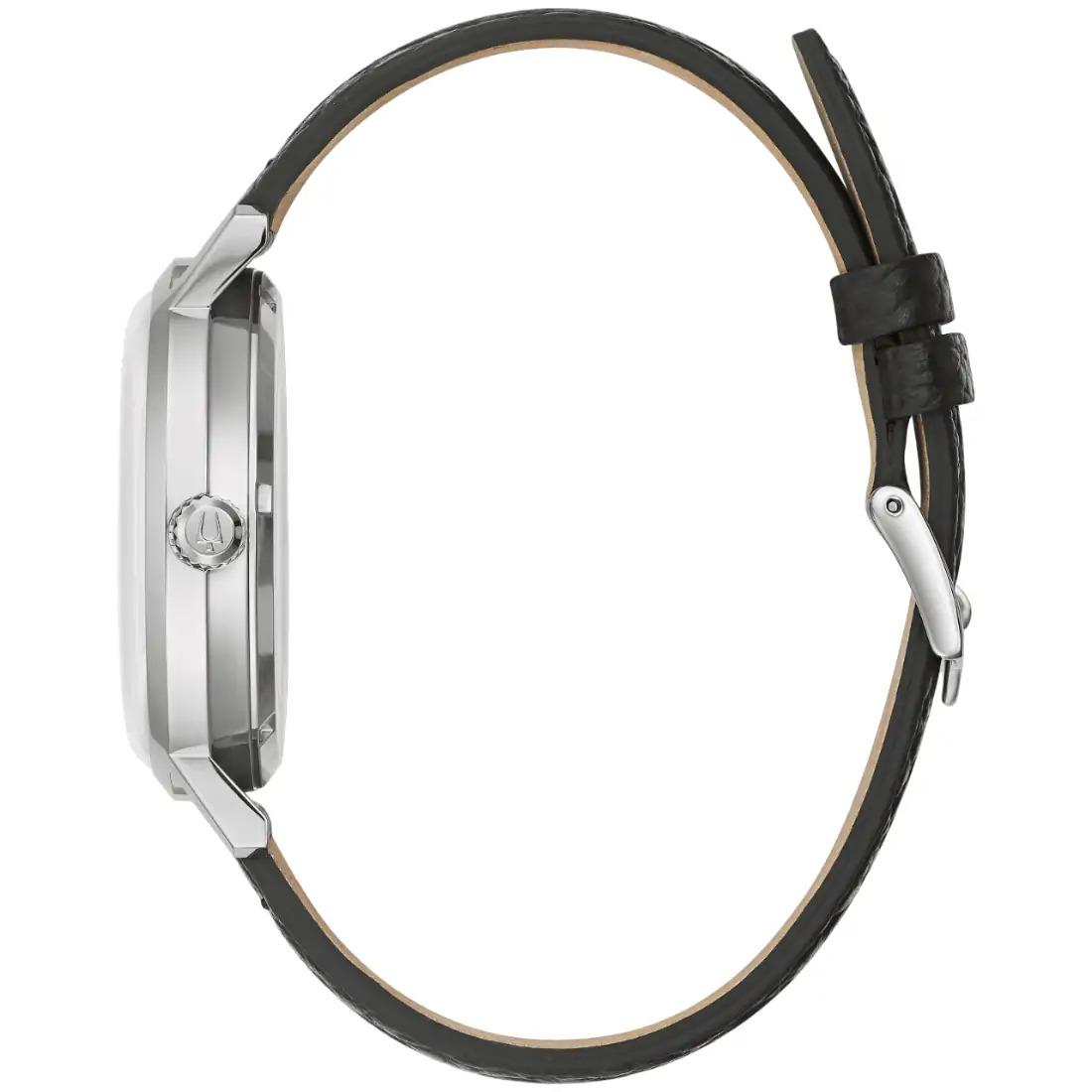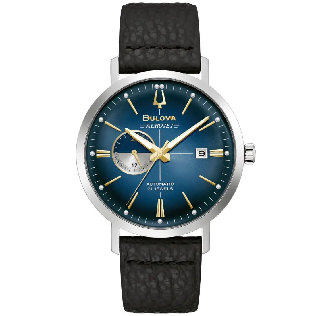 Reloj Bulova para caballero Colección Aerojet inspirado en los 60's.Movimiento mecánico de cuerda automática de 3 manecillas, subcarátula indicador de día y noche y fechador. Reserva de marcha de 42 horas. Caja realizada en acero inoxidable. Carátula azul con efectos de rayo de sol, indicadores y manecillas e indicadores en dorado. Logo vintage Aerojet. Correa de piel negra, broche tipo hebilla de 3 piezas. Tapa transparente, Cristal mineral.