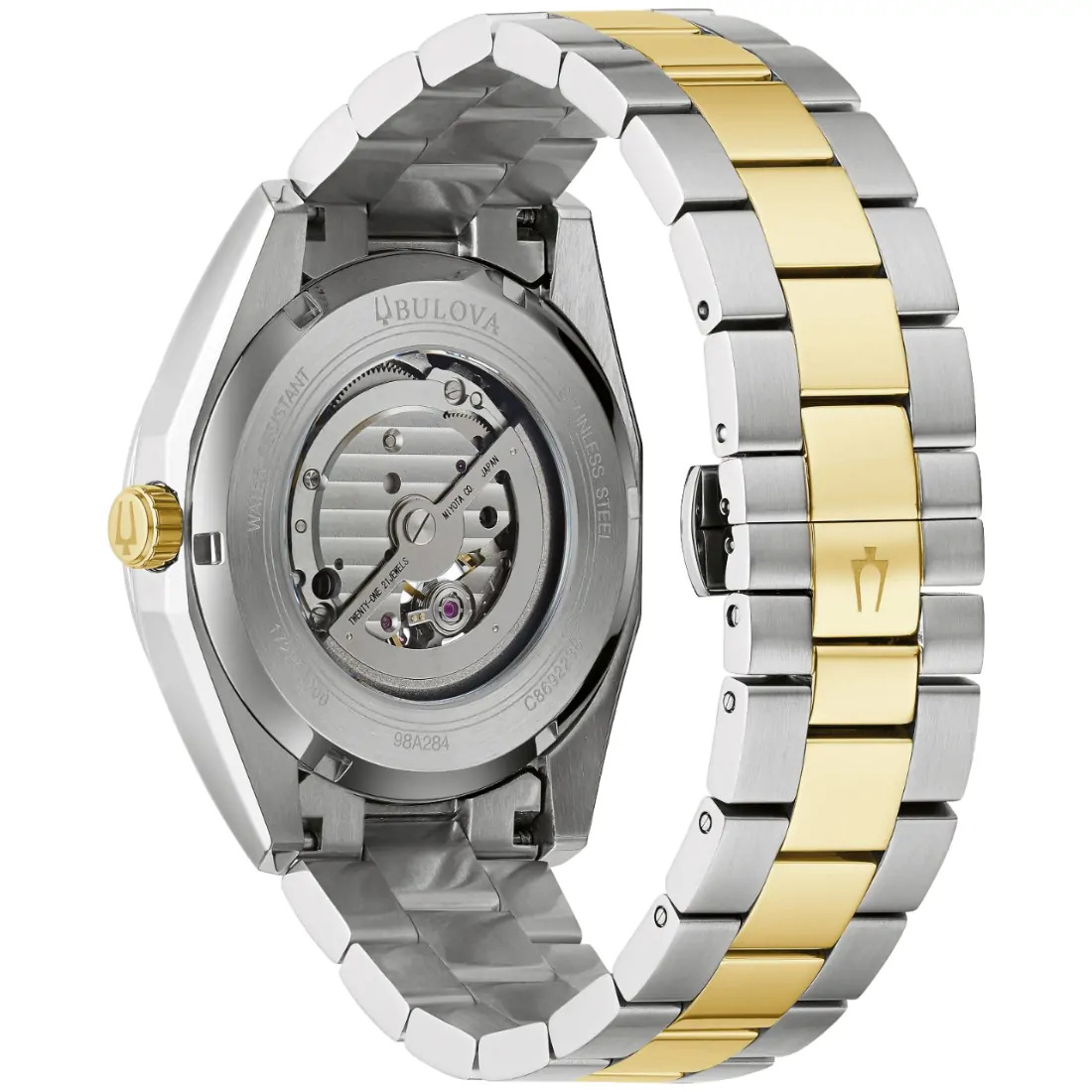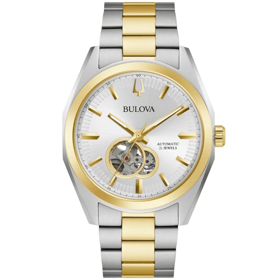 Reloj Bulova para caballero Colección Surveyor. Movimiento mecánico de cuerda automática de 3 manecillas Miyota W2S0 Reserva de marcha de 42 horas. Caja y brazalete realizados en acero inoxidable dos tonos acero/dorado, broche desplegable de doble pulsador. Bisel superior y corona en dorado. Carátula blanco-plateada con apertura que permite ver el mecanismo en funcionamiento del reloj, indicadores y manecillas en dorado. Tapa transparente Cristal mineral.