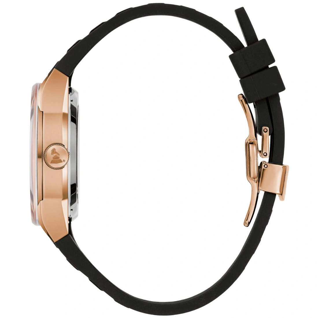 Reloj Bulova Unisex, colección Latin Grammy Edición 25 aniversario. Movimiento mecánico de cuerda automática de 4 manecillas y 2 subcarátulas. 42 horas de reserva de marcha. Caja realizada en acero inoxidable acabado PVD oro rosa. Carátula texturizada blanca que asemeja el raspador de un güiro con apertura que permite observar el funcionamiento del reloj, indicadores y manecillas en oro rosa. Subcáratulas de segundero, y 24 hrs.