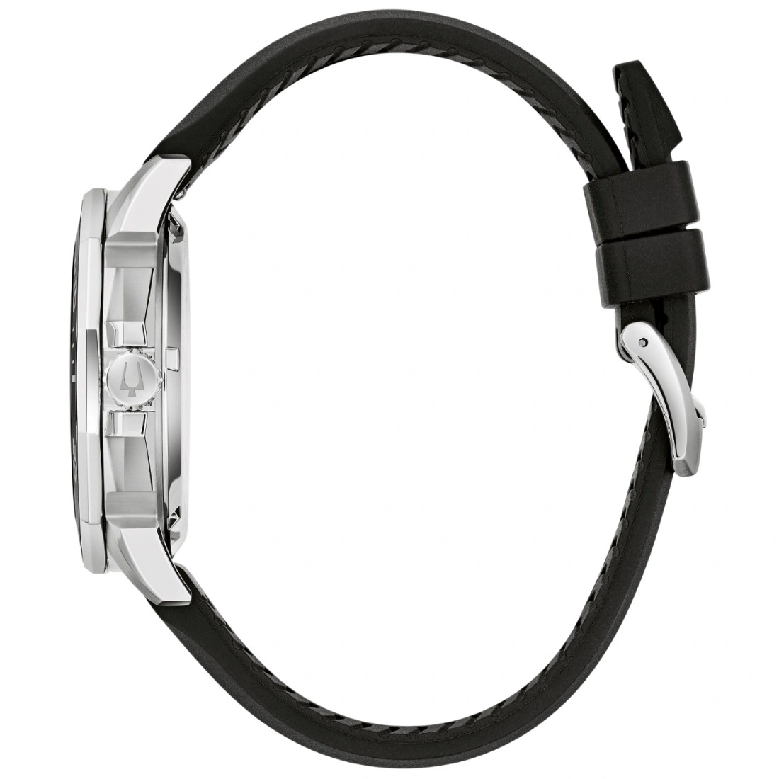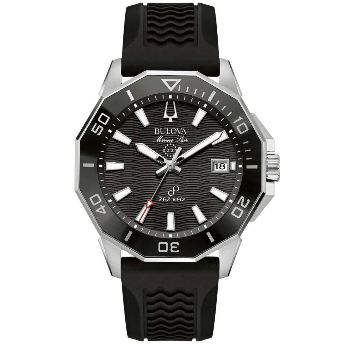 Reloj Bulova colección Marine Star para Caballero. Movimiento Precisionist de 3 manecillas y fechador. Caja en forma poligónica realizada en acero inoxidable. Bisel superior unidireccional de tiempo transcurrido en acero con inserto de cerámica negro. nCarátula texturizada que asemeja las olas de mar en negro, indicadores y manecillas luminiscentes; segundero de movimiento continuo con detalle rojo en punta. Correa de caucho negra, broche tipo hebilla de 3 piezas.