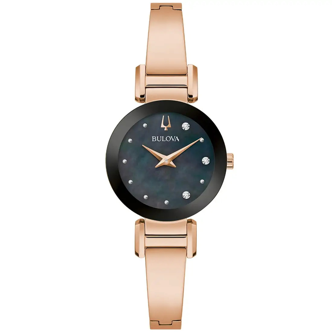 Reloj Bulova colección Marc Anthony para Dama. 3 diamantes montados a mano de forma individual como indicadores. Movimiento de cuarzo de 2 manecillas. Caja realizada en acero inoxidable acabado PVD negro. Carátula en Madre Perla negra, manecillas en oro rosa, diamantes como indicadores en posición de la 1,3 y 5 hrs. Brazalete realizado en acero inoxidable acabado PVD oro rosa, broche tipo joyería. Cristal mineral metalizado de borde a borde. Frase Icónica de Marc Anthony “Valió la pena” y autógrafo grabados en tapa trasera.