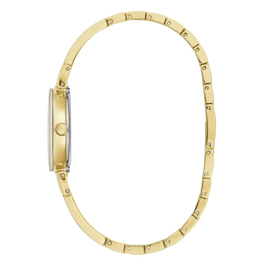 Reloj Bulova colección Marc Anthony para Dama.3 diamantes montados a mano de forma individual como indicadores. Movimiento de cuarzo de 2 manecillas. Caja y brazalete realizados en acero inoxidable acabado PVD dorado, broche tipo joyería. Carátula y manecillas en dorado, diamantes como indicadores en posición de la 1,3 y 5 hrs. Cristal mineral metalizado de borde a borde. Frase Icónica de Marc Anthony “Valió la pena” y autógrafo grabados en tapa trasera.