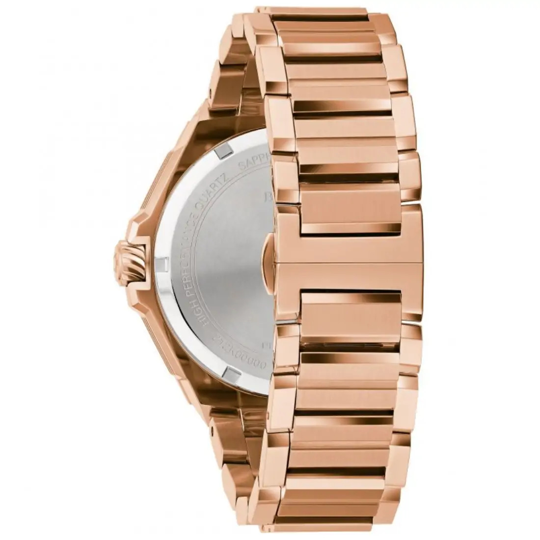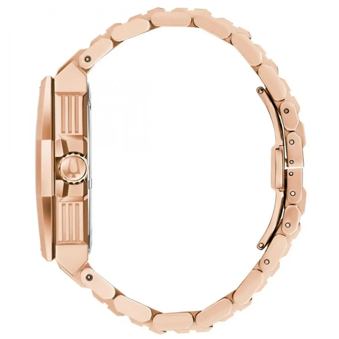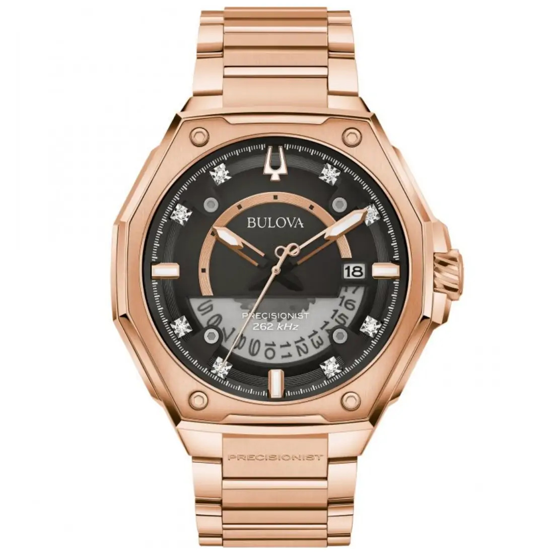 Con sus distintivos elementos de diseño arquitectónico masculino y su caja y brazalete de acero inoxidable en tono oro rosa, este reloj de hombre con diamantes Serie X causa una primera impresión audaz. Lleve su precisión al siguiente nivel con este innovador y elegante reloj que fusiona diseño y tecnología. Reloj Bulova colección Precisionist X para Caballero con 8 diamantes montados a mano de forma individual en carátula como indicadores.