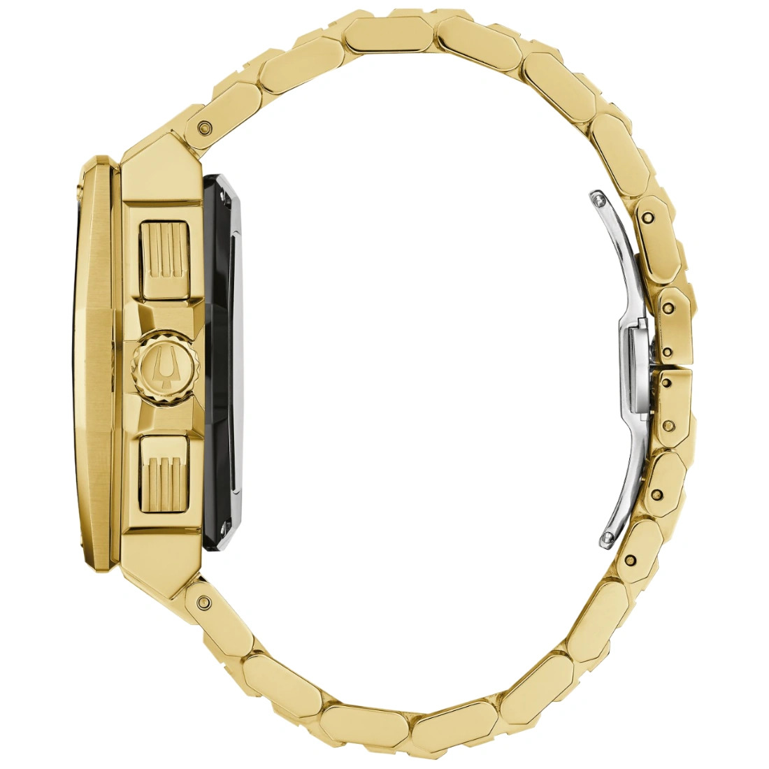 Reloj Bulova “Precisionist” Edición 10mo aniversario para Caballero. Movimiento cronógrafo de cuarzo de alto rendimiento que brinda una exactitud incomparable a 1/1000 de segundo con segundero de movimiento continuo con 4 subcarátulas, 8 manecillas y fechador. Caja y brazalete realizados en acero inoxidable acabado PVD dorado, broche desplegable de doble pulsador. Carátula negra, indicadores y manecillas doradas con puntas en acabado blanco luminiscente, segundero, manecillas de décimas y centésimas de segundo en dorado. Bisel superior con una placa en acero de damasco en bisel.