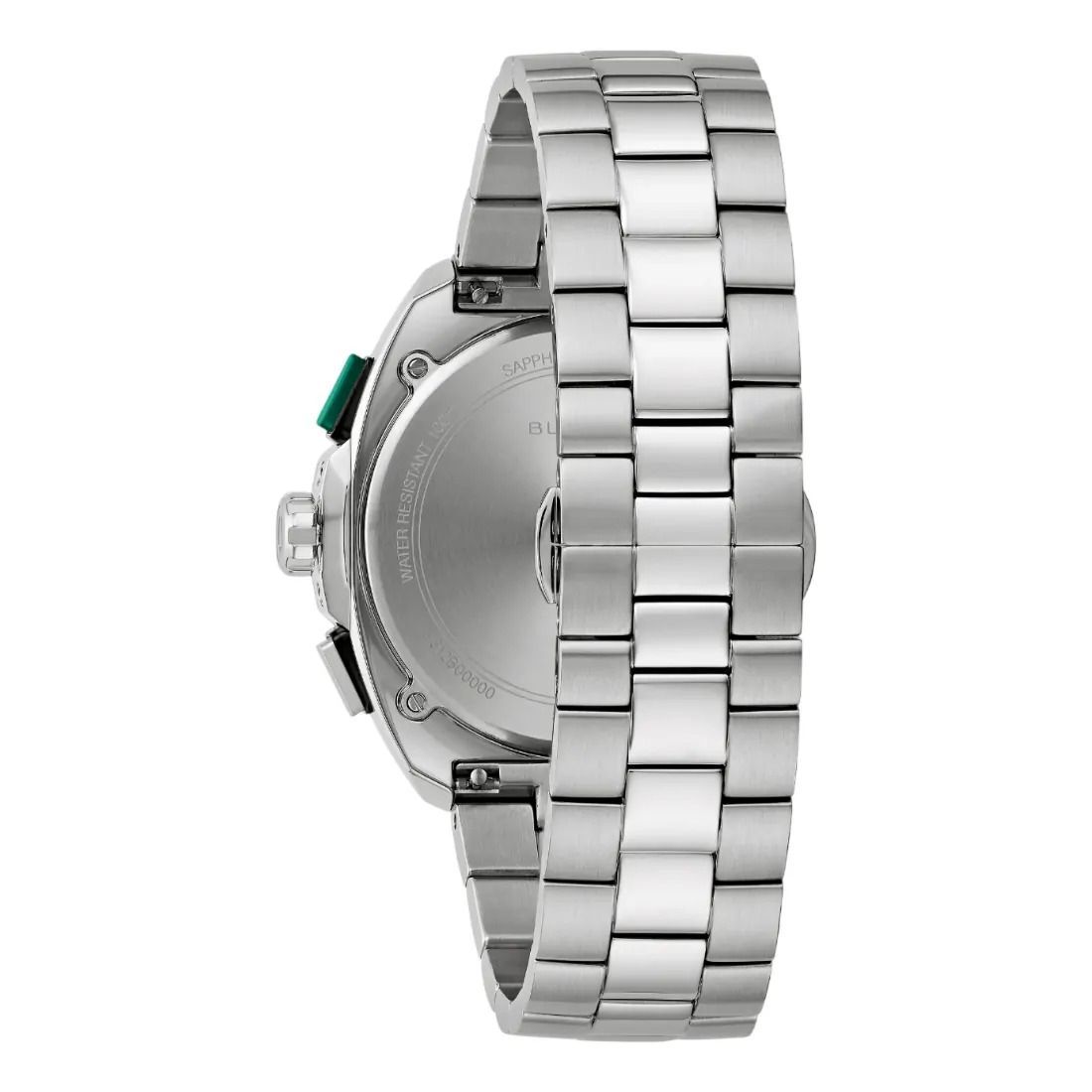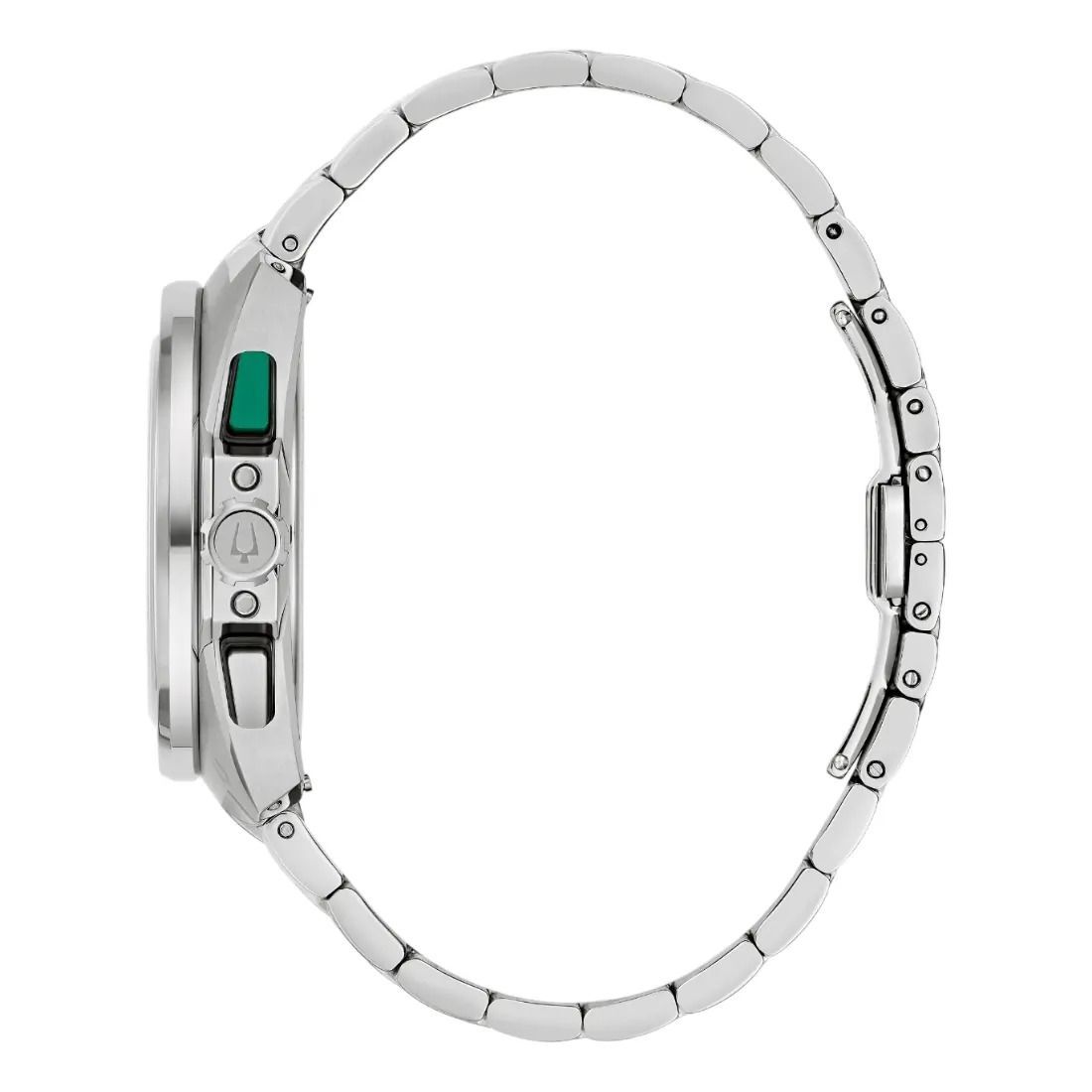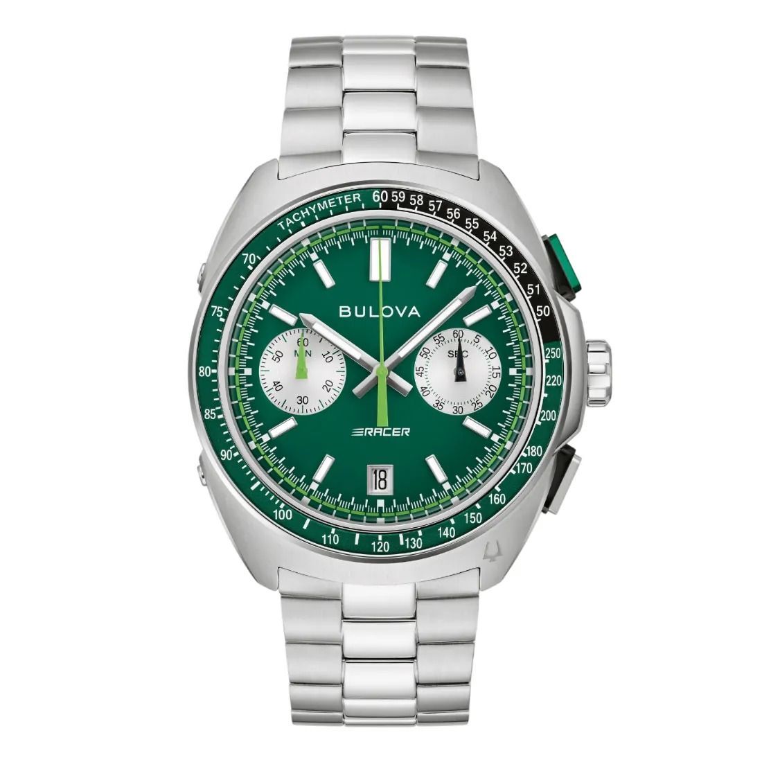 Verde con detalles plateados, indicadores y manecillas luminiscentes