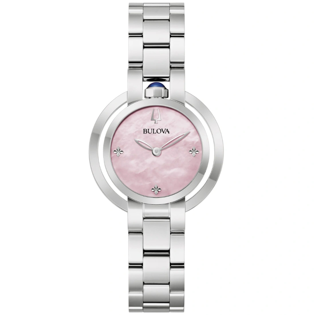 Reinventando el estilo legendario, este reloj Bulova para mujer presenta un nuevo modelo pequeño a la histórica colección Rubaiyat. Una corona de cabujón de espinela azul sintética acentúa la caja de acero inoxidable plateada que cuenta con un cristal de zafiro y un brazalete a juego con cierre desplegable y botón pulsador. Realce cualquier conjunto, de día o de noche, con este reloj femenino Bulova por excelencia