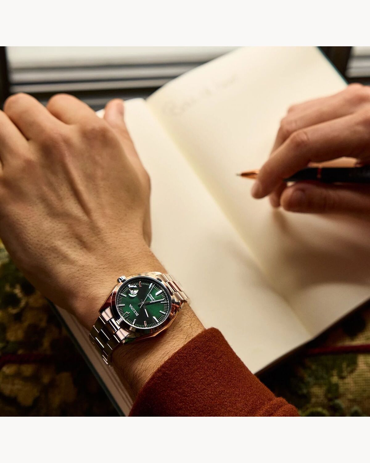 Reloj Bulova colección Surveyor Unisex. Movimiento mecánico de cuerda automática de 3 manecillas y fechador tipo lupa. 42 horas de reserva de marcha. Caja y brazalete realizados en acero inoxidable, broche desplegable de doble pulsador. Carátula verde, indicadores, manecillas en plateado. Cristal de zafiro