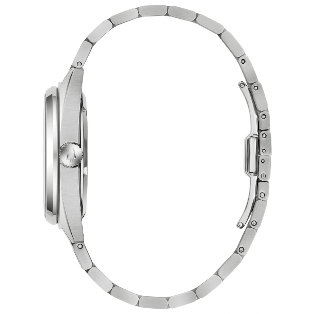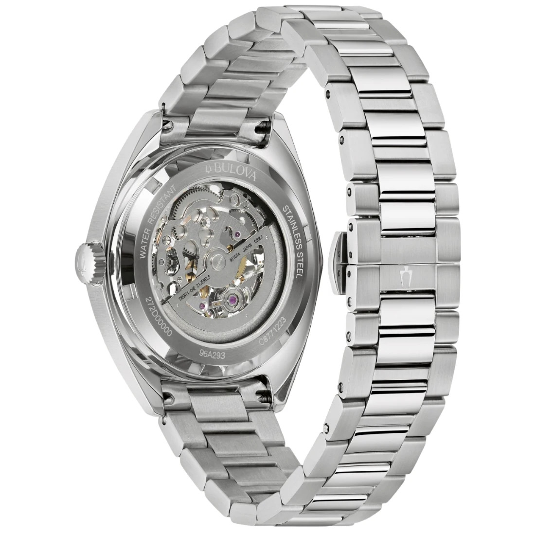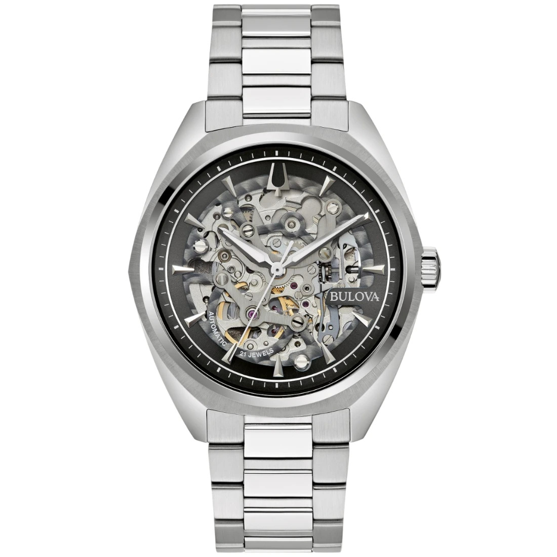 Reloj Bulova para Caballero colección Surveyor. Movimiento mecánico de cuerda automática de 3 manecillas. Reserva de marcha de 42 horas. Caja y brazaletes realizados en acero inoxidable acabado tipo titanio broche desplegable de doble pulsador. Carátula esqueletada, indicadores y manecillas luminiscentes en plateado. Bisel interno en negro. Tapa transparente atornillable.