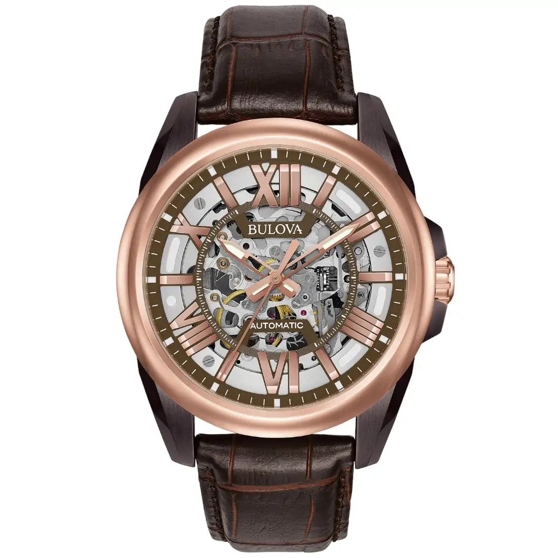 Reloj Bulova para caballero Movimiento mecánico de cuerda automática de 3 manecillas. Caja realizada en acero inoxidable acabado PVD oro rosa. Carátula esqueletada que permite ver le movimiento del reloj en funcionamiento con indicadores en números romanos y manecillas en oro rosa. Correa de piel café con broche tipo hebilla de 3 piezas. Tapa transparente cristal mineral.