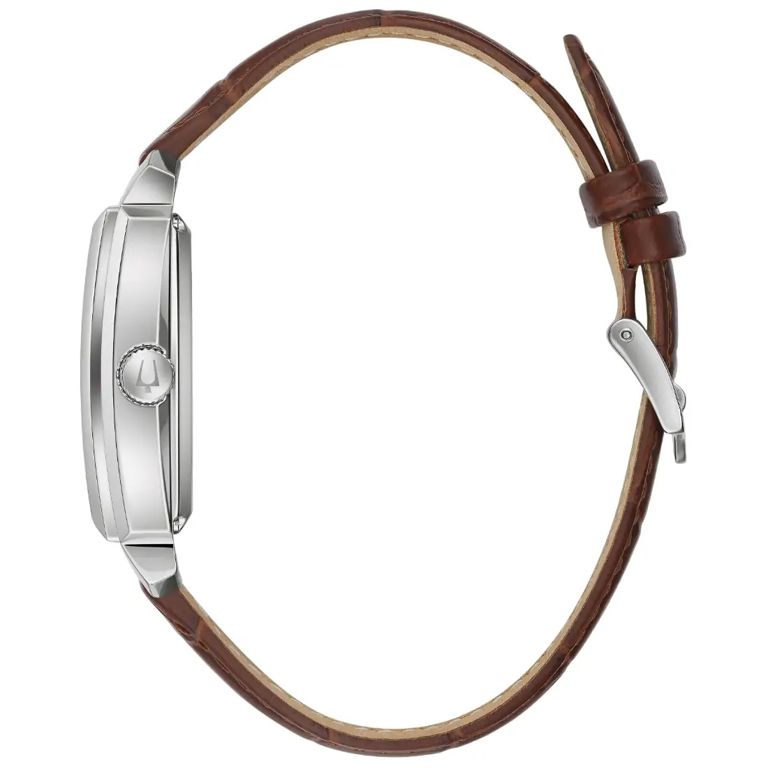 Reloj Bulova para caballero Colección Sutton, inspirado en el Bulova 1948 President. Reserva de marcha de 42 horas. Movimiento mecánico de cuerda automática de 3 manecillas. Caja rectangular realizada en acero inoxidable. Carátula texturizada blanca, con apertura que permite ver el funcionamiento del reloj en movimiento, manecillas e indicadores en oro rosa. Correa de piel café acabado tipo cocodrilo, broche tipo hebilla de 3 piezas. Tapa transparente. Cristal mineral.