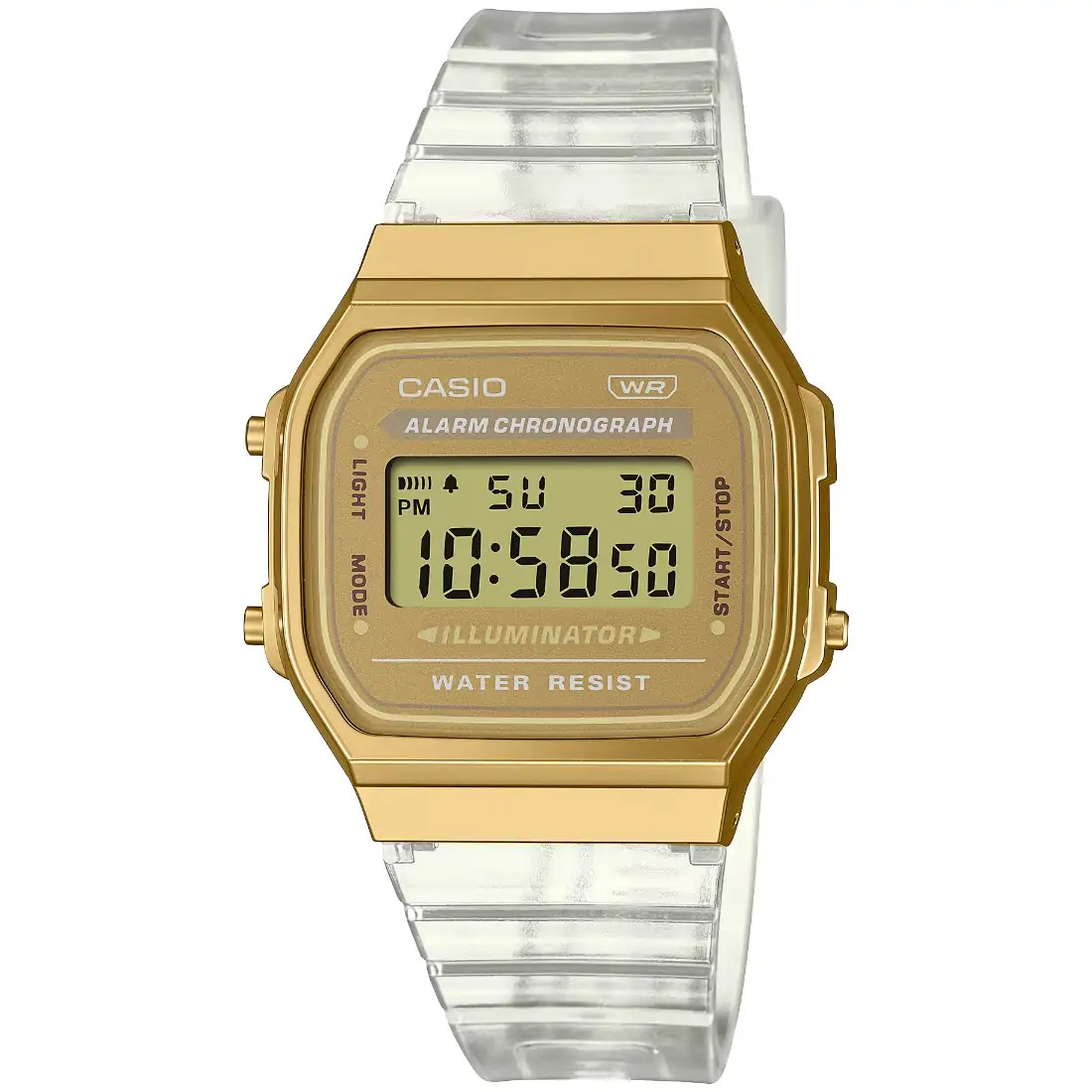 Tamaño de la caja (largo × ancho × alto): 39.4 × 36.3 × 9.7 mm Peso: 25 g Material de la caja y el bisel: Resina/tono dorado Correa de resina Resistencia al agua de 30 m Fuente de alimentación: pila
