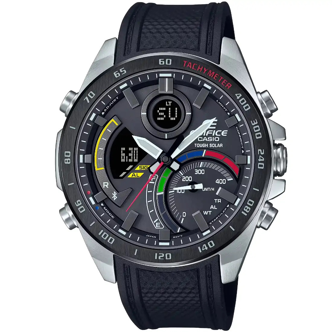 Manténgase a la altura con la verdadera forma, funcionalidad y sofisticación de los deportes motorizados en un reloj multicolor para carreras EDIFICE. El dial atrevido se acentúa con toques coloridos inspirados en el diseño de los volantes de los autos de carreras. El segundero y otros componentes codificados por color garantizan la sobresaliente visibilidad que los equipos de carreras necesitan para tomar decisiones en fracción de segundo y actuar con rapidez.