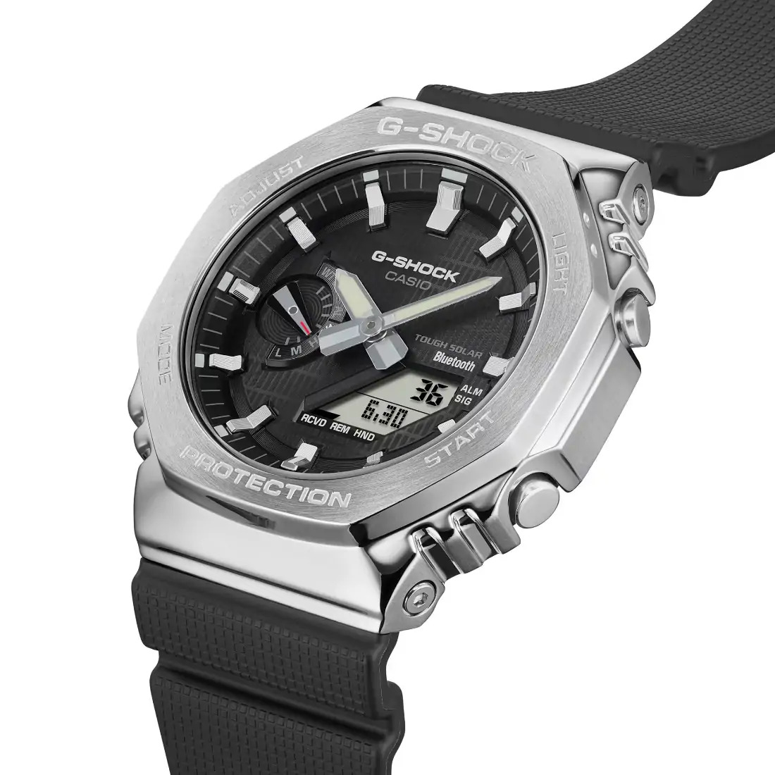 Hora mundial 38 zonas horarias Cronómetro Temporizador con cuenta regresiva 5 alarmas diarias Señal de hora Luz LED doble Blanco Calendario automático completo (hasta el año 2099) Función de silencio Función de ahorro de energía Indicador de nivel de carga de la batería Precisión: h15 segundos por mes (sin la función Mobile Link) Función de movimiento de agujas (las agujas se apartan para proporcionar una visión sin obstrucciones del contenido digital de la pantalla). Formato de 12 y 24 horas Cambio de visualización de fecha/mes Visualización del día (días de la semana seleccionables en seis idiomas) Funciones clásicas de reloj: Analógica: 2 manecillas (hora, minuto [la manecilla se mueve cada 20 segundos]), 1 dial (nivel de carga de la batería, modo) Digital: horas, minutos, segundos, p. m., mes, fecha, día