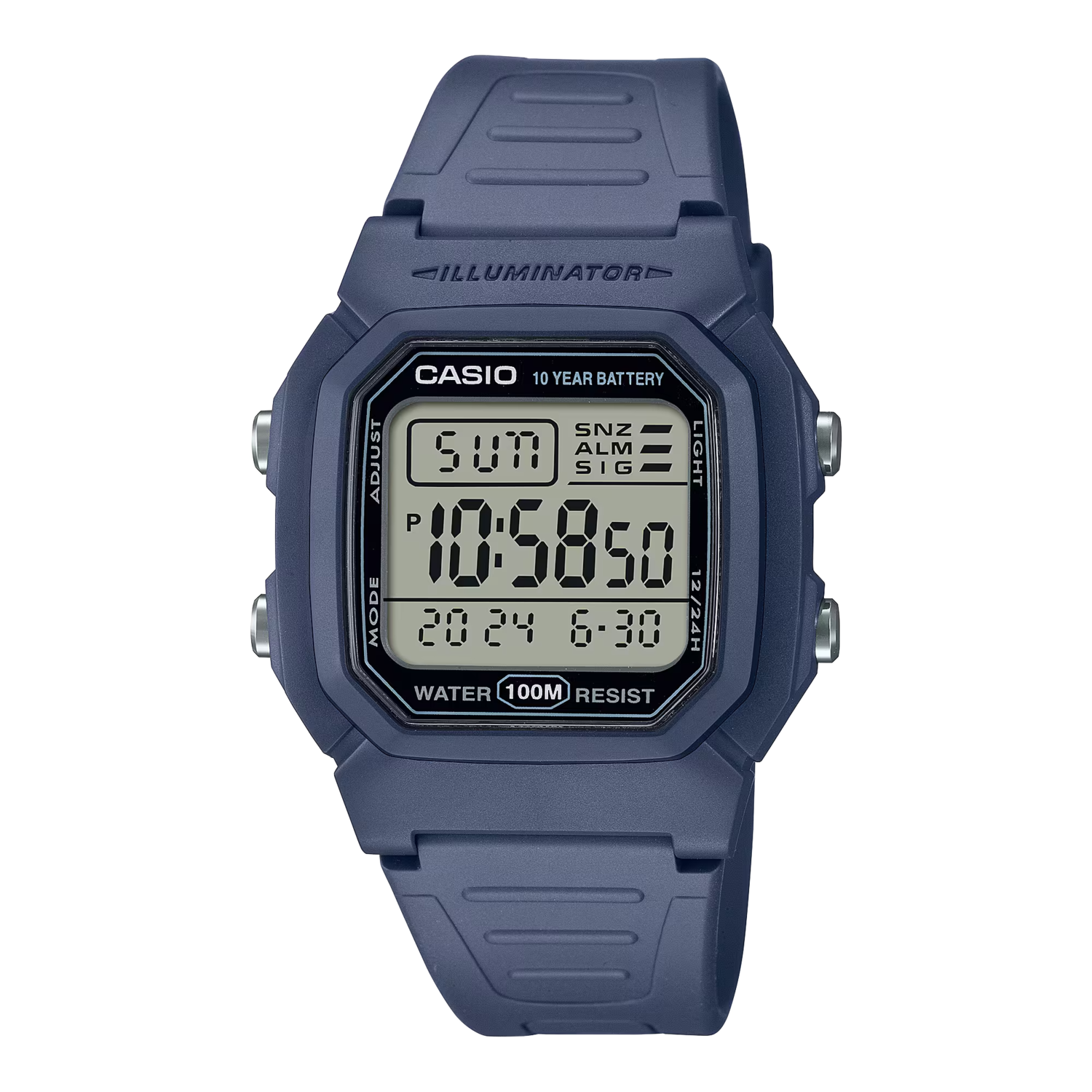 Simplicidad definida: un reloj digital elegante con una gran pantalla que muestra claramente la hora de un vistazo. Cuenta con resistencia al agua de hasta 100 metros, una batería de 10 años de duración, retroiluminación LED y otras funciones útiles.
