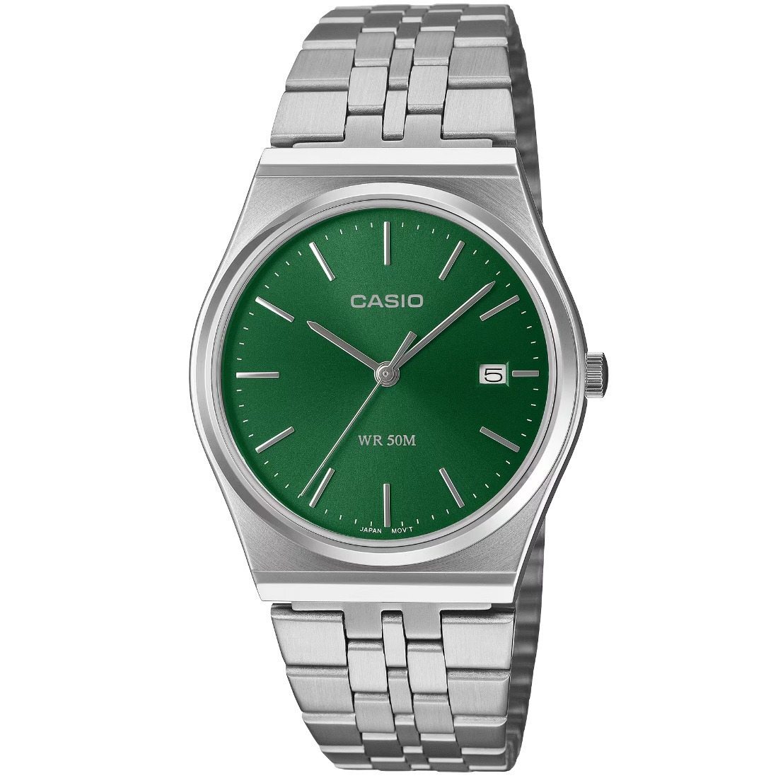 Tamaño de la caja (largo × ancho × alto): 40 × 35 × 7.4 mm - Material de la caja/bisel: Acero inoxidable - Peso: 82 g - Correa: Correa de acero inoxidable Broche de una pulsación y triple pliegue - Resistencia al agua de 50 m - Fuente de alimentación: pila