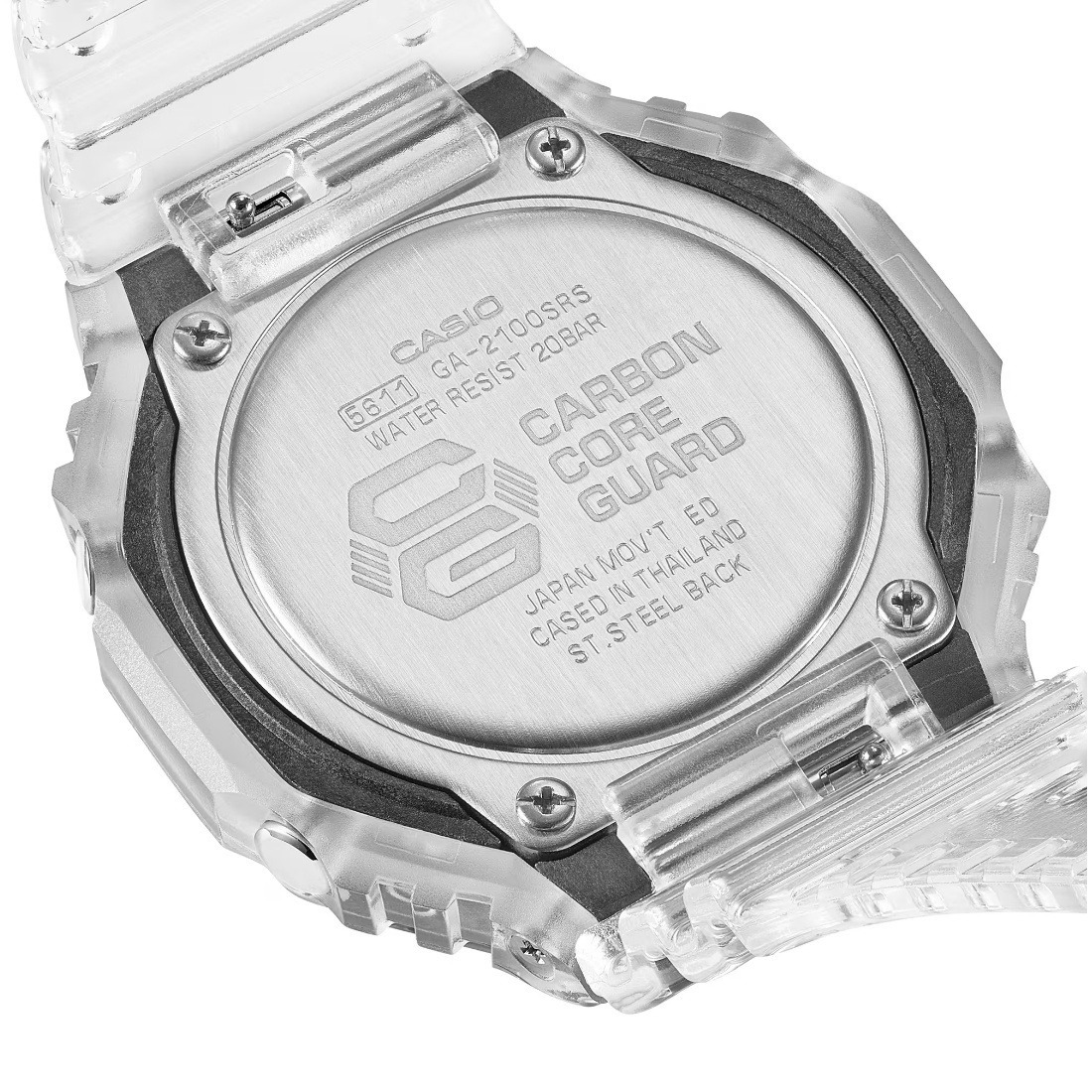 Tamaño de la caja (L× W× H): 48.5 × 45.4 × 11.8 mm Material de la caja/bisel: Carbono/resina Peso: 51 g Correa de resina Resistente a impactos Estructura Carbon Core Guard Resistencia al agua de 200 m Fuente de alimentación: Pila