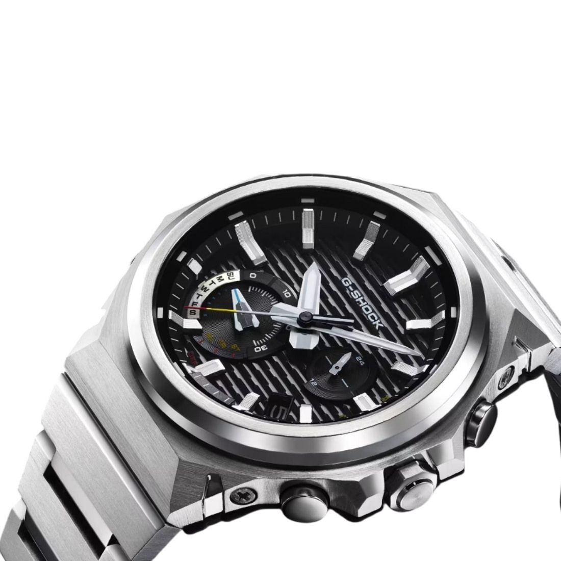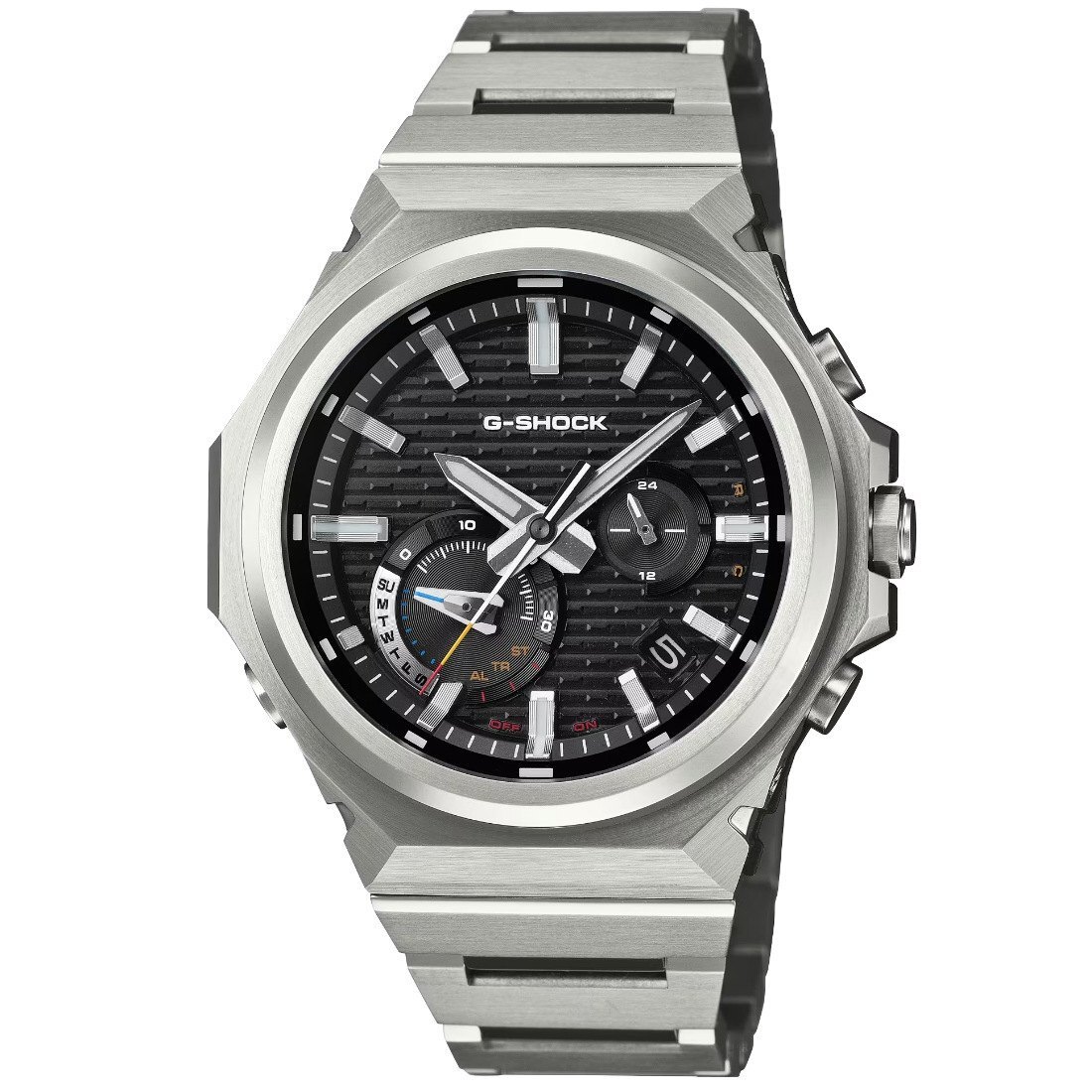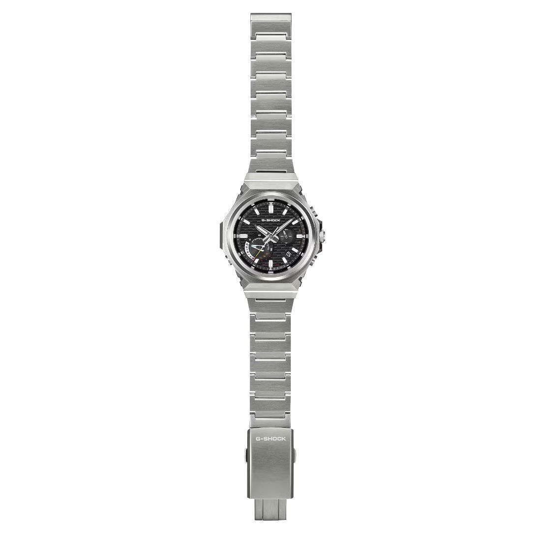 Tamaño de la caja (largo × ancho × alto):46.9 × 44.2 × 11.6 mm - Material de la caja/bisel:Carbono de origen biológico/acero inoxidable - Peso: 118 g - Correa: Sólida correa de acero inoxidable Broche de una pulsación y triple pliegue - Construccion: Resistente a impactos Estructura Carbon Core Guard - Resistencia al agua de 200 m - Fuente de alimentación: Tough Solar (con energía solar)
