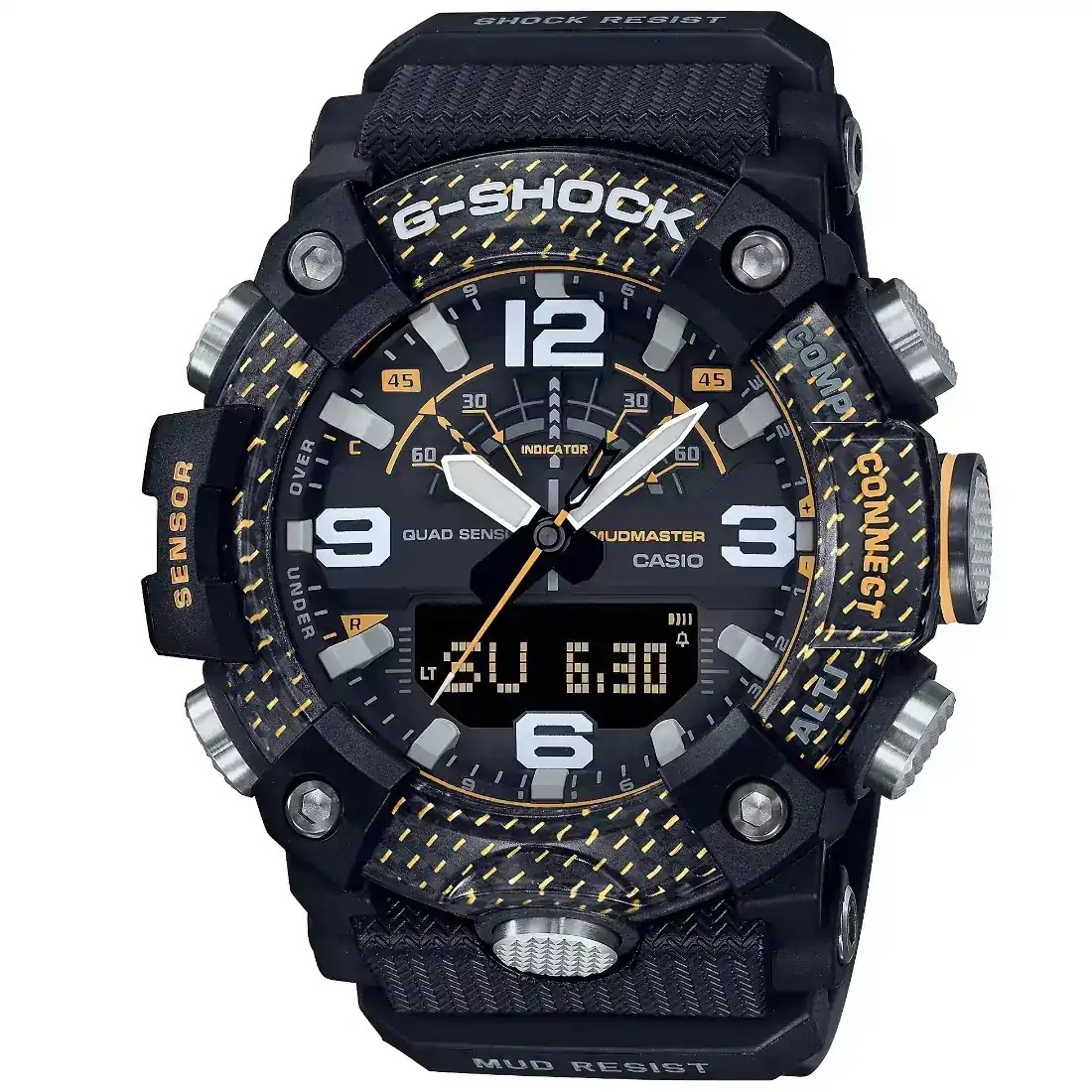 Tamaño de la caja (L× W× H): 55.4 × 51.3 × 19.4 mm Material de la caja/bisel: Carbono/resina Peso: 92 g Correa de resina Resistente a impactos Resistente al barro Estructura Carbon Core Guard Resistencia al agua de 200 m Fuente de alimentación: pila Conteo de pasos mediante sensor de aceleración de 3 ejes Altímetro Barómetro Brújula digital Termómetro