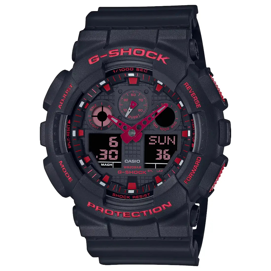 Tamaño de la caja (L× W× H): GA-100BNR-1A Material de la caja/bisel: Resina Peso: 72 g Correa de resina Resistente a impactos Resistencia magnética Resistencia al agua de 200 m Fuente de alimentación: pila