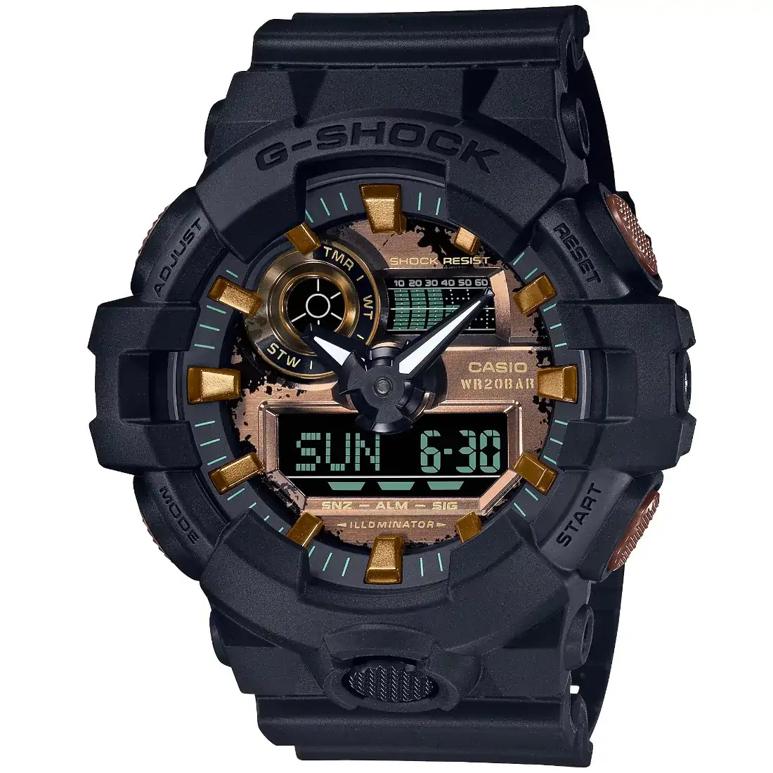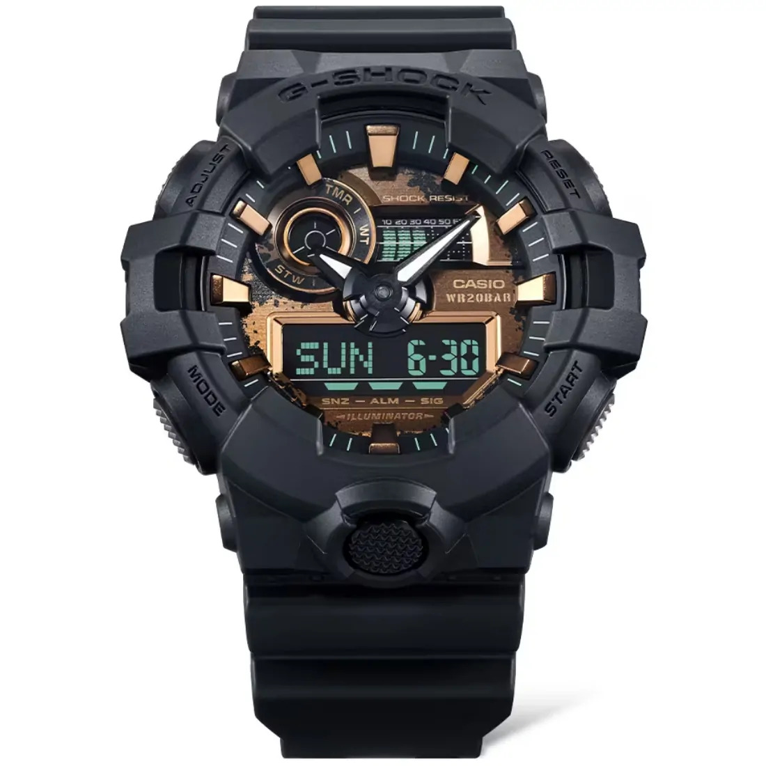 Potencie su apariencia con G-SHOCK en un diseño que evoca el hierro oxidado que resiste el paso del tiempo. Estos relojes rinden homenaje a la eterna búsqueda de G-SHOCK de la máxima resistencia con diseños neoclásicos en negro y una oxidación que evocan la tenacidad pura del hierro oxidado. Los tonos sepia, inspirados en la textura del metal oxidado, complementan el negro de la base. Los detalles en azul claro crean un estilo atemporal con un toque rústico.
