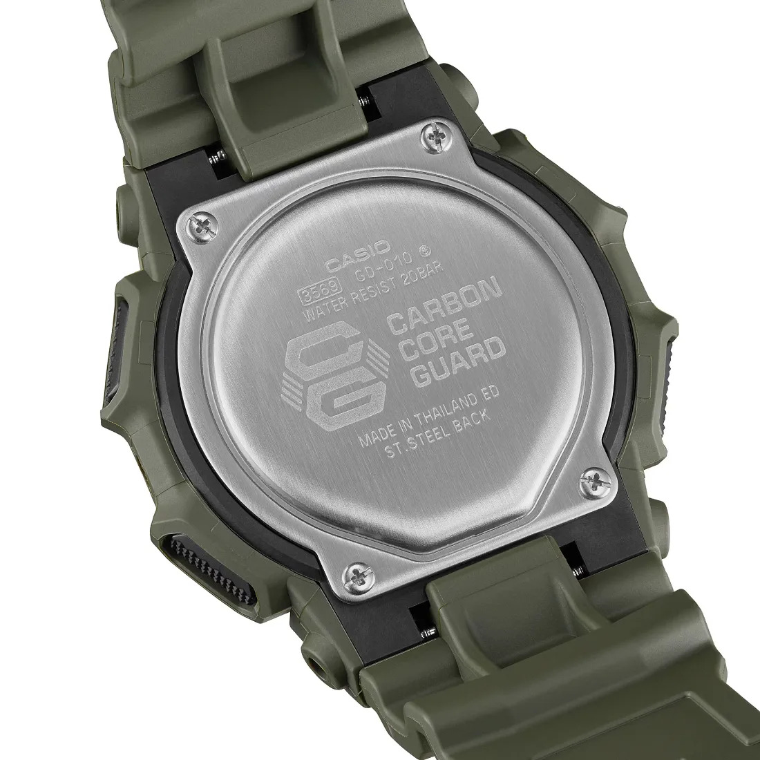 Tamaño de la caja (L× W× H): 54.9 × 51.9 × 16.1 mm Material de la caja/bisel: Carbono de origen biológico/resina de origen biológico Peso: 65 g Correa de resina de base biológica Resistente a impactos Estructura Carbon Core Guard Resistencia al agua de 200 m Fuente de alimentación: pila