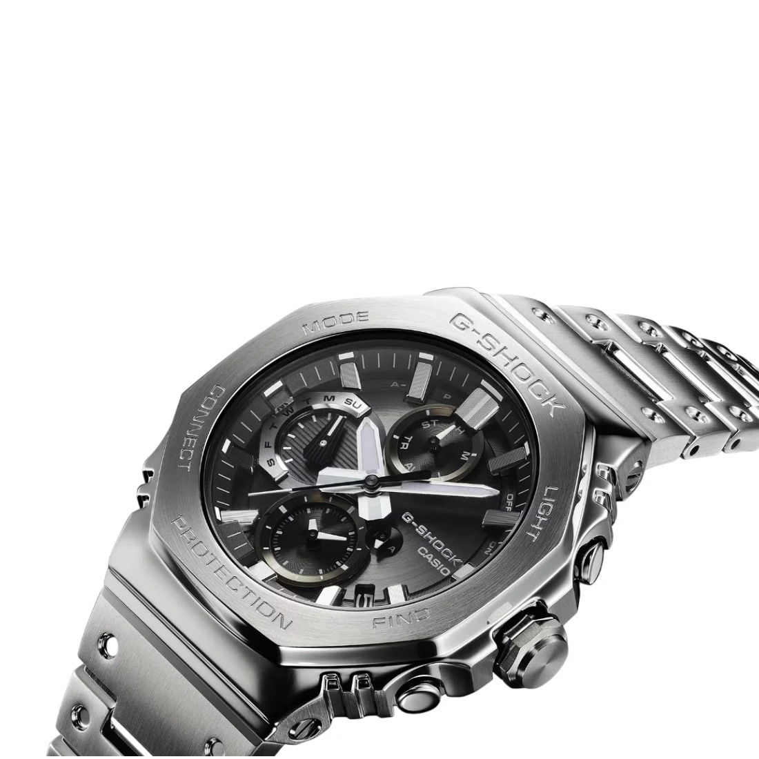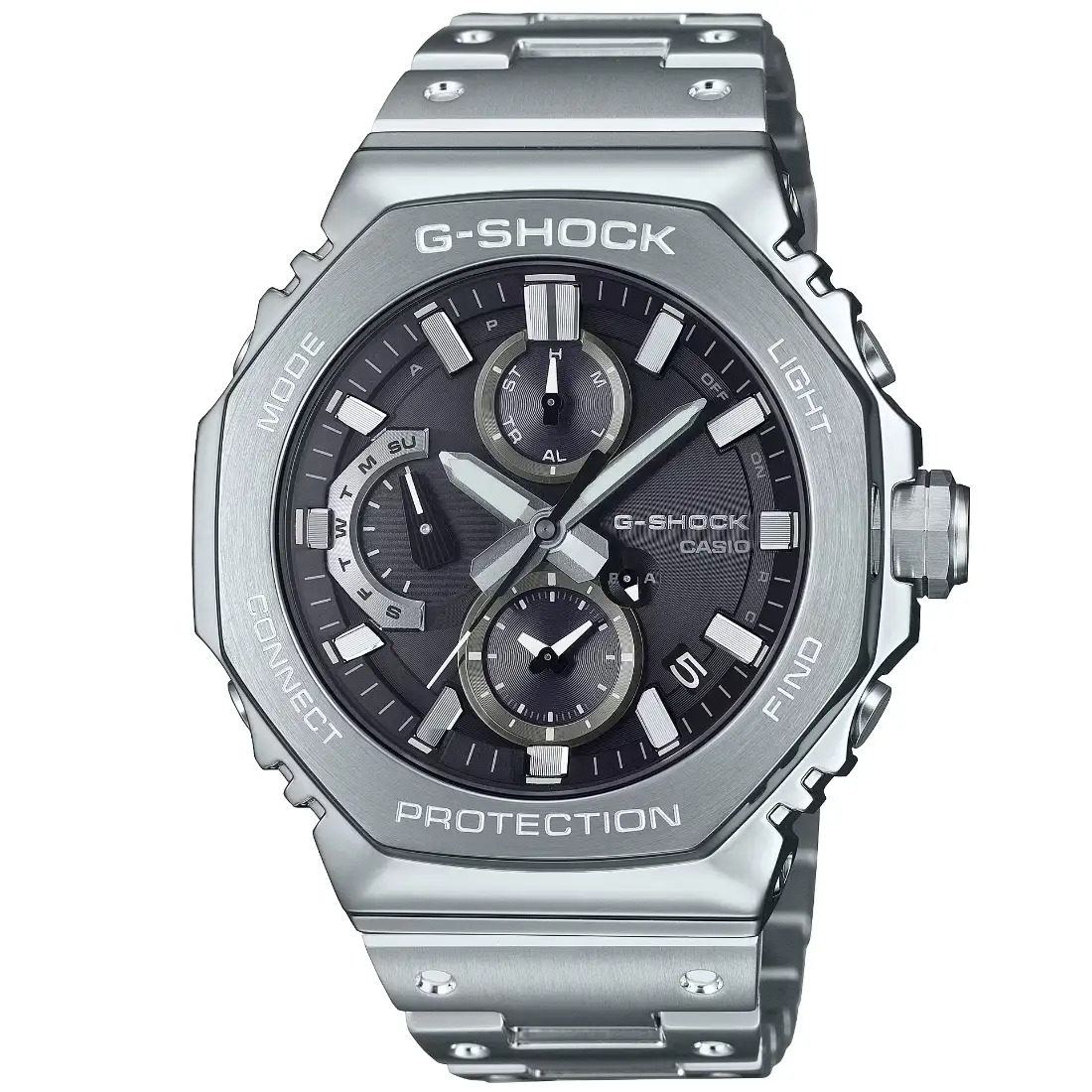 Tamaño de la caja (L× W× H): 51.3 × 46.3 × 12.4 mm Material de la caja/bisel: Acero inoxidable Peso: 171 g Correa de acero inoxidable Broche de una pulsación y triple pliegue Resistente a impactos Bluetooth: Se conecta a un teléfono inteligente y ajusta automáticamente la hora. Resistencia al agua de 200 m Fuente de alimentación: Tough Solar (con energía solar)