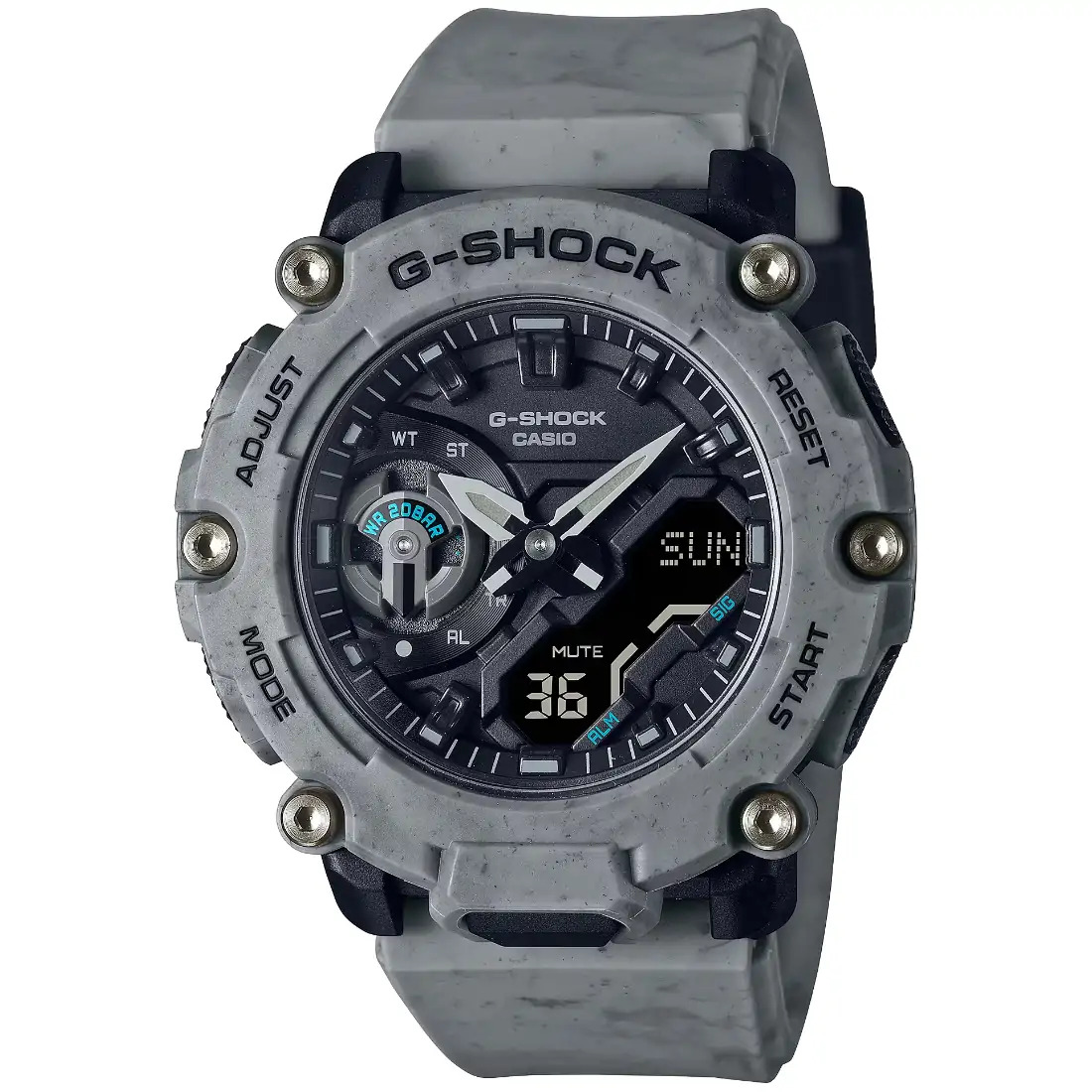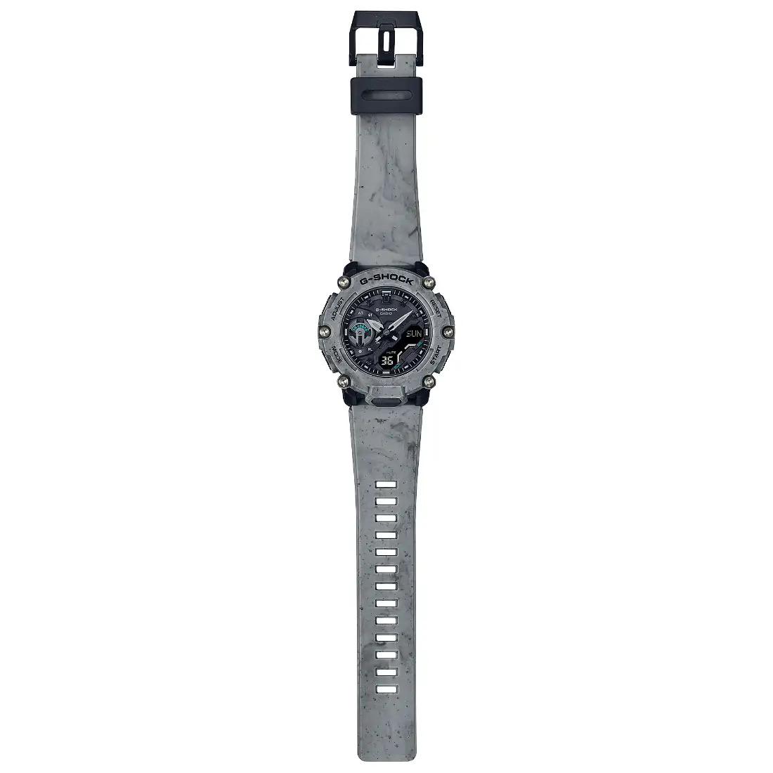 Tamaño de la caja (L× W× H): 50.8 × 47.1 × 13.1 mm Material de la caja/bisel: Resina Peso: 57 g Correa de resina Estructura Carbon Core Guard Resistente a impactos Resistencia al agua de 200 m Fuente de alimentación: pila