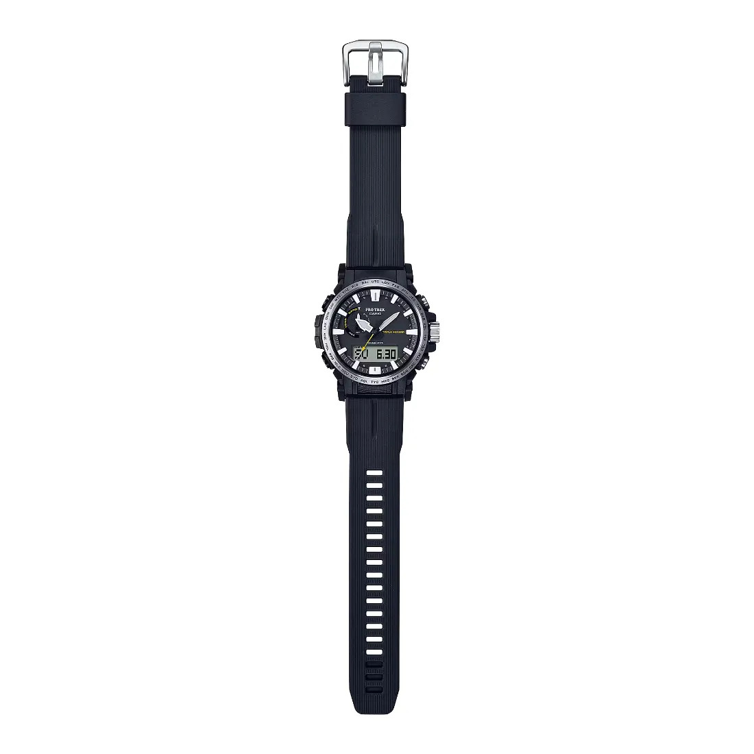 Tamaño de la caja (L× W× H): 54.2 × 47.4 × 14.7 mm Material de la caja/bisel: Resina de base biológica/acero inoxidable Peso: 53 g Correa de uretano suave (resina de base biológica) Resistente a bajas temperaturas (-10°C / 14°F) Resistencia al agua de 100 m Reloj radio-controlado; Multiband 6 Fuente de alimentación: (con energía solar) Brújula digital Altímetro Barómetro Termómetro