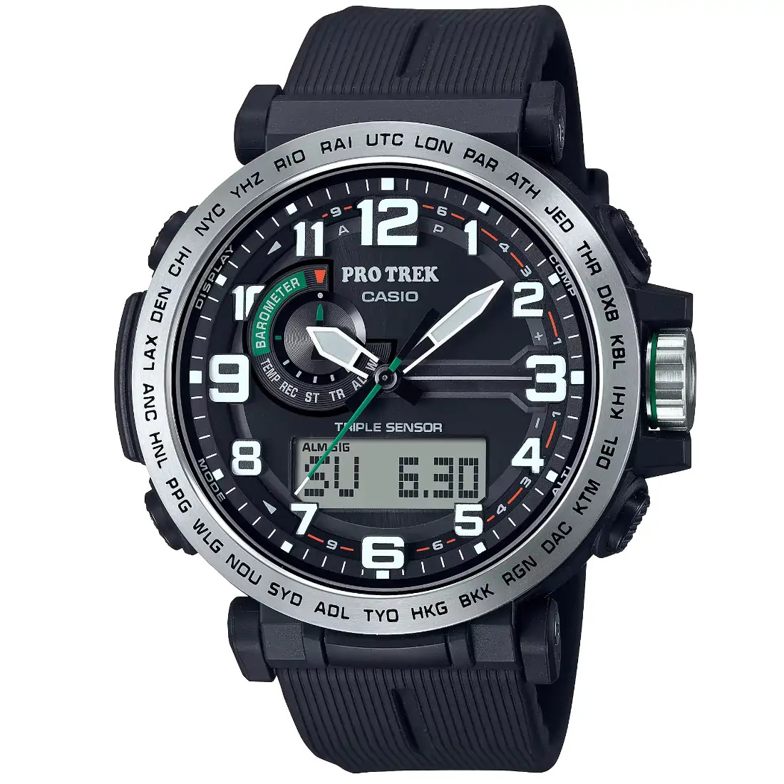Hora mundial, 29 zonas horarias Cronómetro Temporizador con cuenta regresiva 5 alarmas diarias Señal de hora Luz LED doble Calendario automático completo (hasta el año 2099) Función de silencio Función de ahorro de energía Indicador de carga de pila Precisión: h15 segundos por mes Formato de 12 y 24 horas Característica de cambio de las agujas (manual o automático (durante la medición de la presión barométrica, la altitud y la temperatura)) Funciones clásicas de reloj: Analógica: 3 manecillas (hora, minuto [la manecilla se mueve cada 10 segundos], segundo) Digital: Hora, minuto, segundo, a. m./p. m., fecha, día