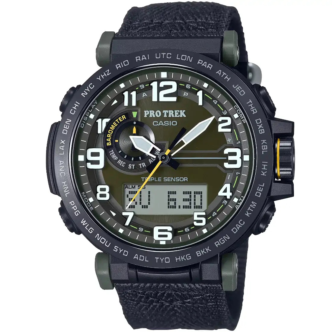 Hora mundial, 29 zonas horarias Cronómetro Temporizador con cuenta regresiva 5 alarmas diarias Señal de hora Luz LED doble Calendario automático completo (hasta el año 2099) Función de silencio Función de ahorro de energía Indicador de carga de pila Precisión: h15 segundos por mes Formato de 12 y 24 horas Característica de cambio de las agujas (manual o automático (durante la medición de la presión barométrica, la altitud y la temperatura)) Funciones clásicas de reloj: Analógica: 3 manecillas (hora, minuto [la manecilla se mueve cada 10 segundos], segundo) Digital: Hora, minuto, segundo, a. m./p. m., fecha, día