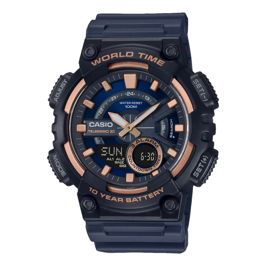 n nReloj Casio Sport deportivo de combinación analógica / digital de color azul marino con detalles en oro rosa ofrece muchas funciones. Una gran cantidad de características como la hora mundial de 30 ciudades_ 3 alarmas diarias_ cronómetro y telemensaje de 16 dígitos.
