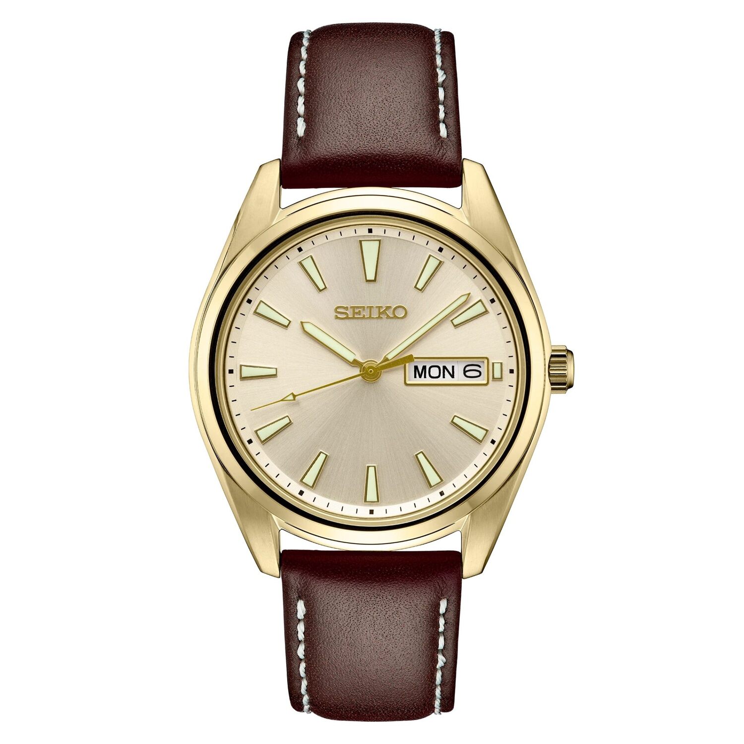 Esfera color champán claro con efecto rayos de sol y detalles dorados. Manecillas y marcadores LumiBrite