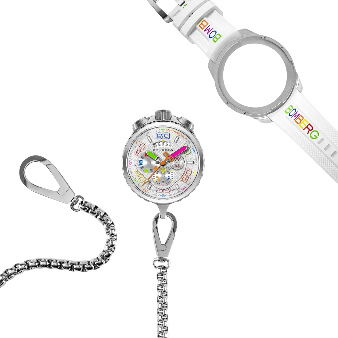 Correa: Correa de silicona blanca con letras multicolores BOMBERG. Hebilla : Acero inoxidable.