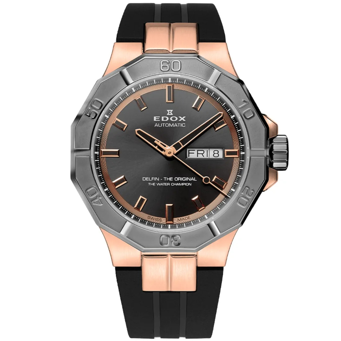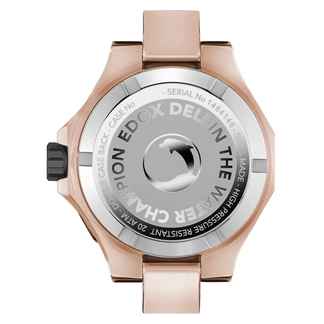 La colección Delfin se lanzó por primera vez en 1961 y utilizó piezas de reloj revolucionarias, como juntas tóricas dobles para coronas y pulsadores, y un fondo de caja especial que absorbe los impactos para resistir una impresionante resistencia al agua de 200 metros. Hoy en día, este equipamiento especial todavía aparece en los relojes Edox Delfin.