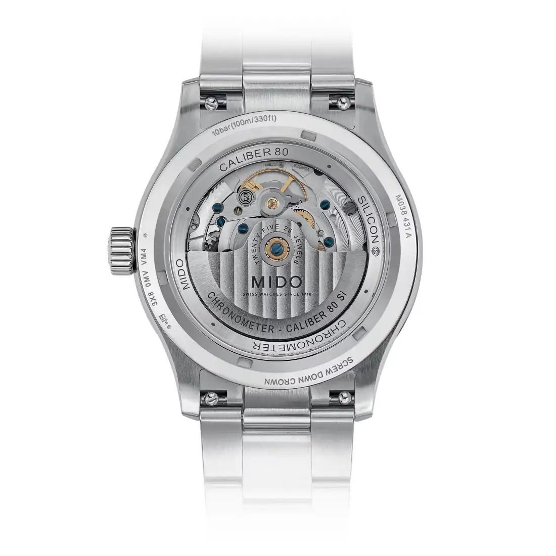 Funciones: Fecha, Día, Silicio, Cronómetro COSC Calibre: Automático Mido Calibre 80 (base ETA C07.821) COSC Movimiento: Mido Cronómetro Automático Reserva de marcha: Reserva de marcha de hasta 80 horas Diámetro movimiento (mm): 25.60 Joyas: 25 Calibre: 11.5 COSC: SI