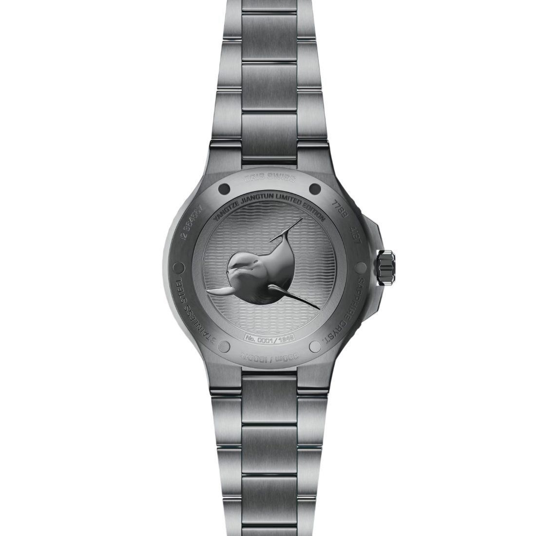 Caja de acero, bisel de tungsteno con escala minutera. Zafiro, ambas caras abombadas, capa interior antirreflejos. Acero inoxidable, atornillada, grabados especiales, Diámetro: 43.50 mm, Hermeticidad: 30 bar, Anchura entre cuernos: 23 mm