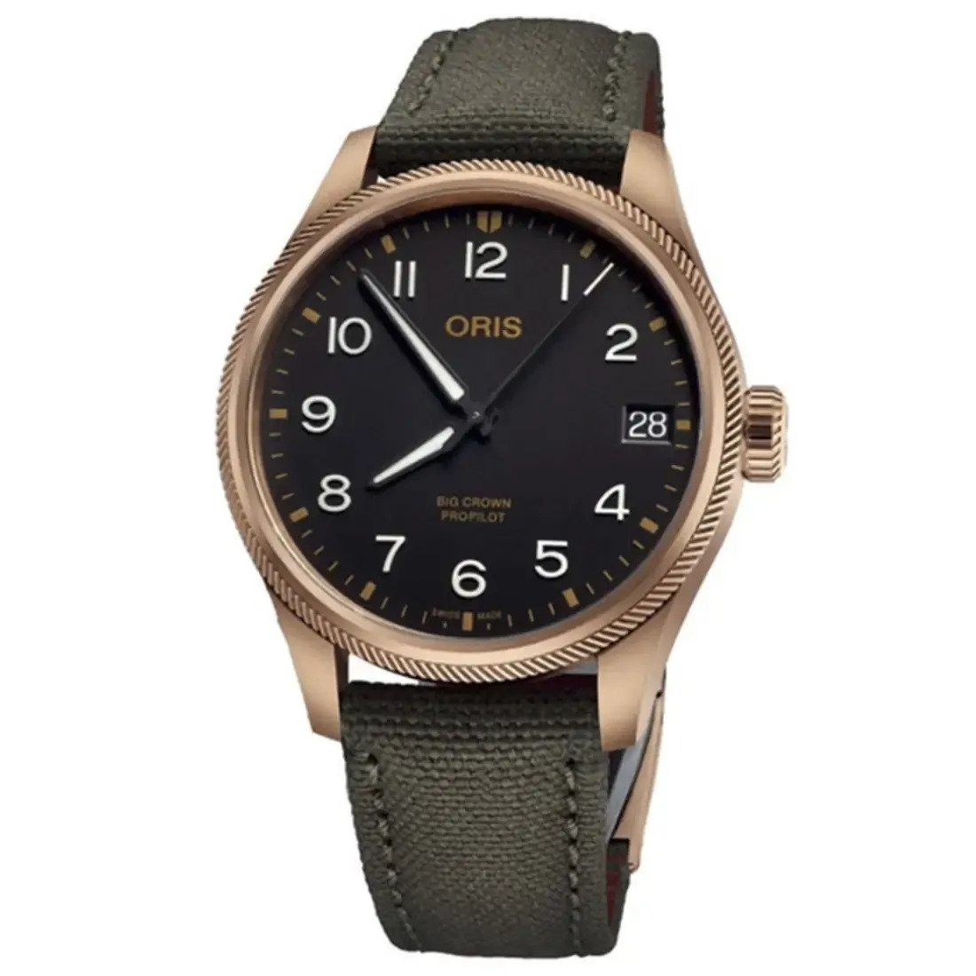 NÚMERO Oris 751, base SW 220-1 DIMENSIONES G 32.20 mm, 14 1/4??? FUNCIONES Agujas centrales para horas, minutos y segundos, ventanilla fecha ampliada, fecha instantánea, corrector de fecha, función cronometradora de precisión y paro segundo REMONTE Remonte automático RESERVA DE MARCHA 41 h VIBRACIONES 28?800 A/h, 4 Hz RUBÍES 26