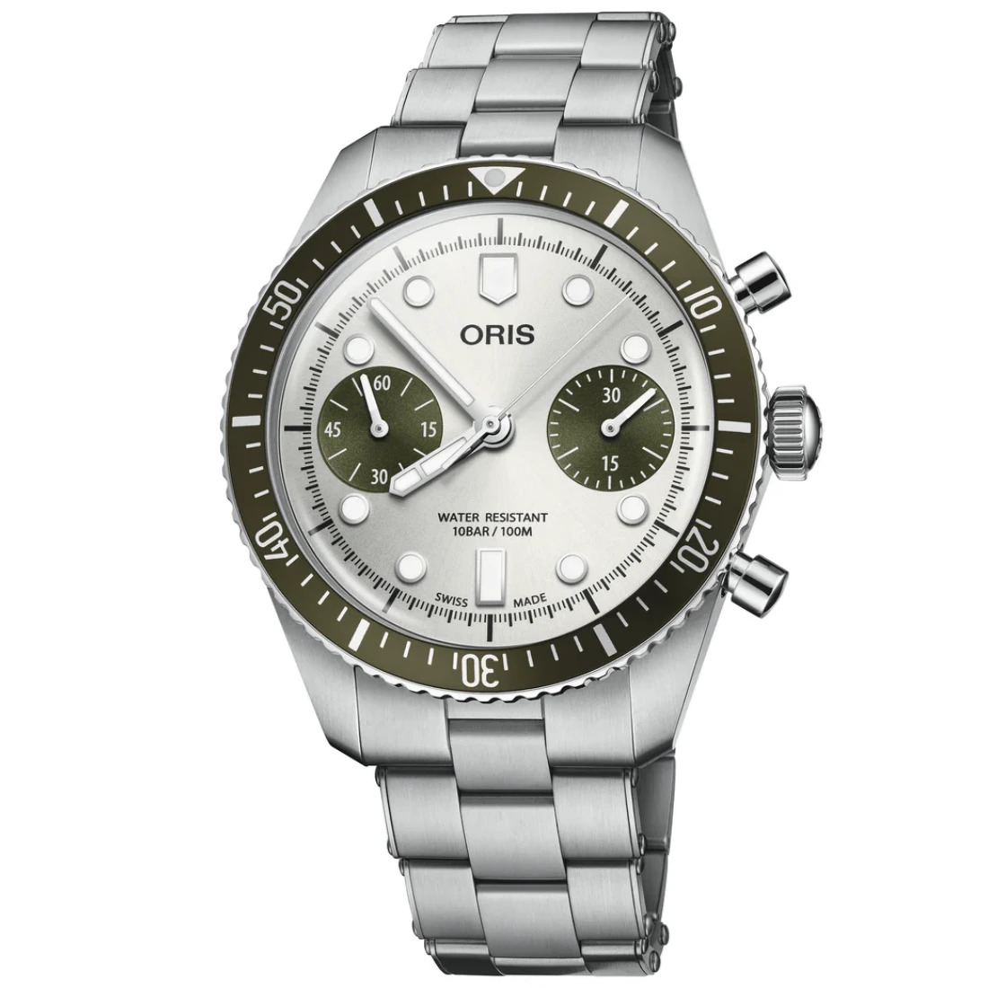 Detalles en verde océano y esfera tornasolada plateada dan a nuestro neo-vintage Divers Sixty-Five Chronograph un aspecto elegante y limpio. Toques retro, como los pulsadores de bomba, complementan el Oris Calibre 771, un cronógrafo automático con una reserva de marcha de 62 horas.