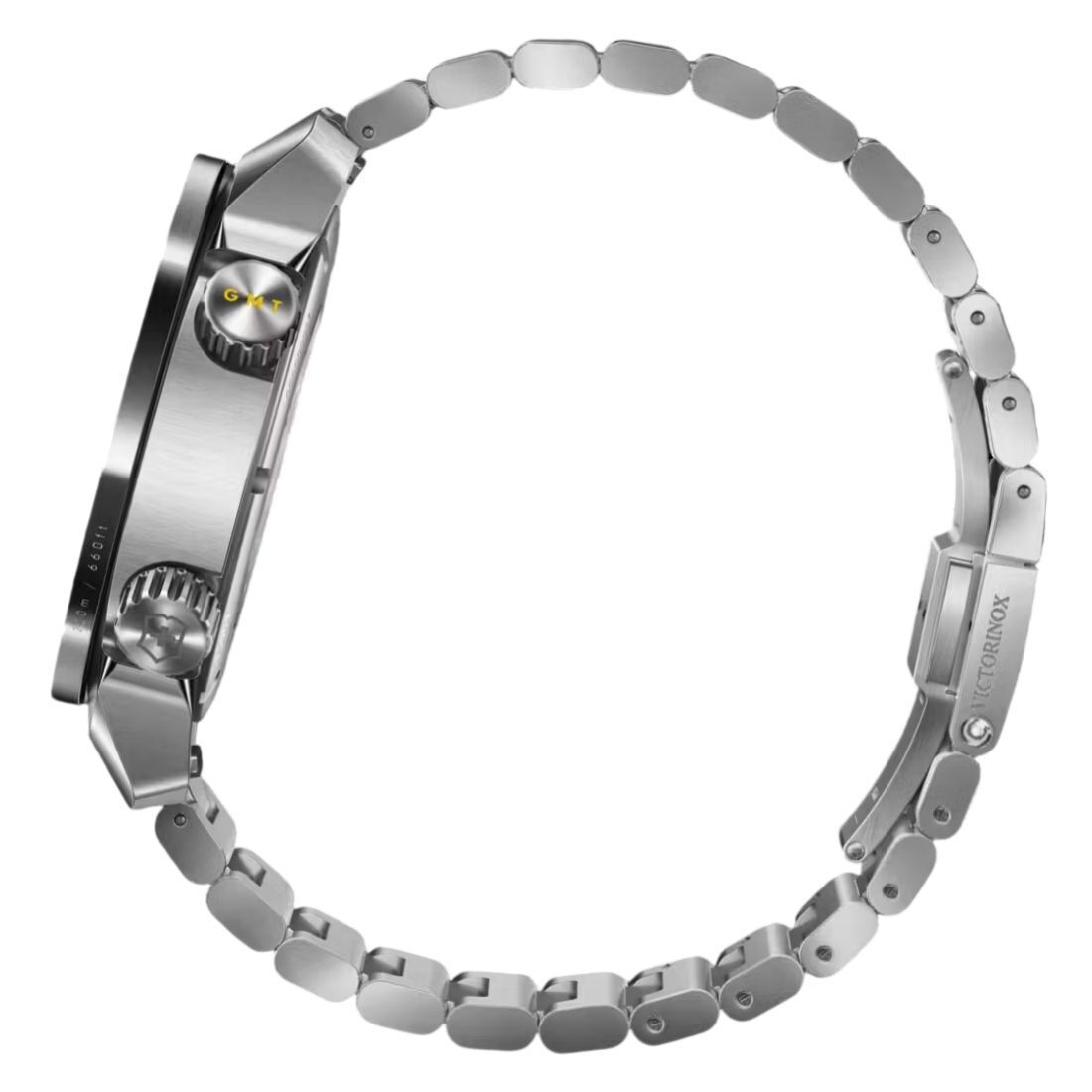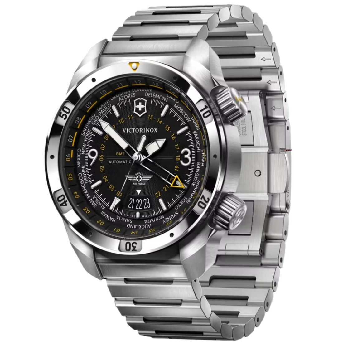 Características clave El Air Pro automático es un reloj preparado para el vuelo, fabricado con precisión y resistencia. Su esfera tridimensional permite seguir hasta tres husos horarios, con el segundo huso horario indicado mediante una manecilla GMT específica. Accionado por el movimiento automático Swiss Made Sellita SW330-2 con una reserva de marcha de 56 horas, cuenta con dos coronas: una corona enroscada a las 4 horas para la hora y otra a las 2 horas para las funciones GMT. Ofrece resistencia ISO a los golpes y al agua hasta 200 m, además de manecillas y marcadores sobredimensionados rellenos de Super-LumiNova® suiza.