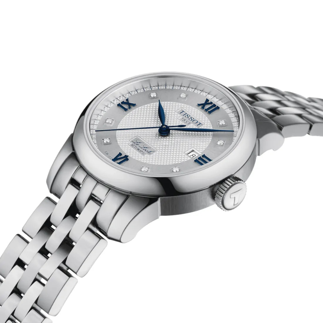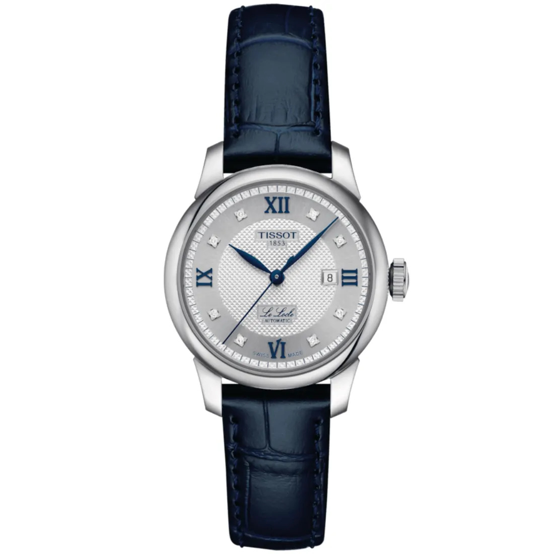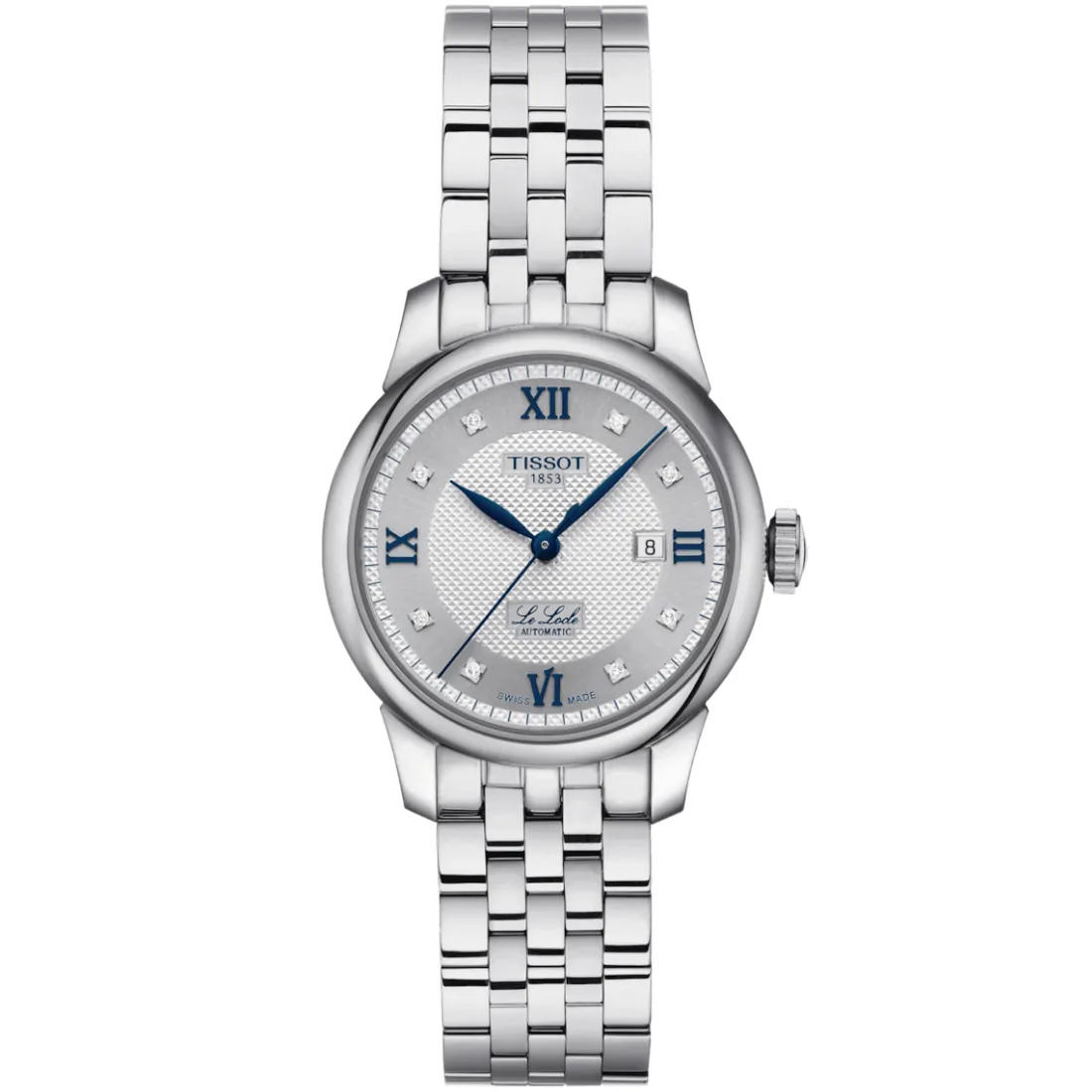 Color de la esfera: Plateado Índices: Romanos + Diamantes Quilates: 0.0304 Pureza: vs-si Color: Top Wesselton Corte: Simple 8 / 8 Diamantes en la esfera: 8